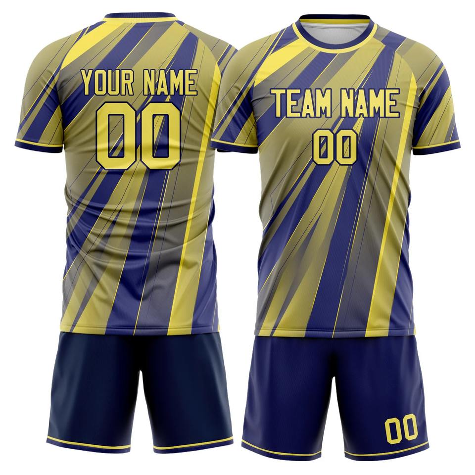 เสื้อฟุตบอลคอกลมและกางเกงขาสั้นปรับแต่งได้พร้อมชื่อทีมและจำนวนทำจากวัสดุโพลีเอสเตอร์สำหรับใส่เล่นฟุตบอล