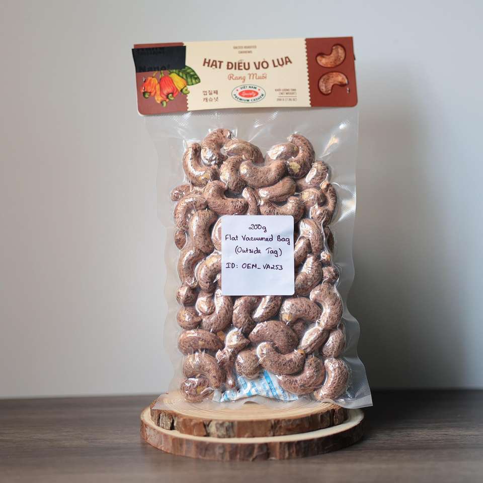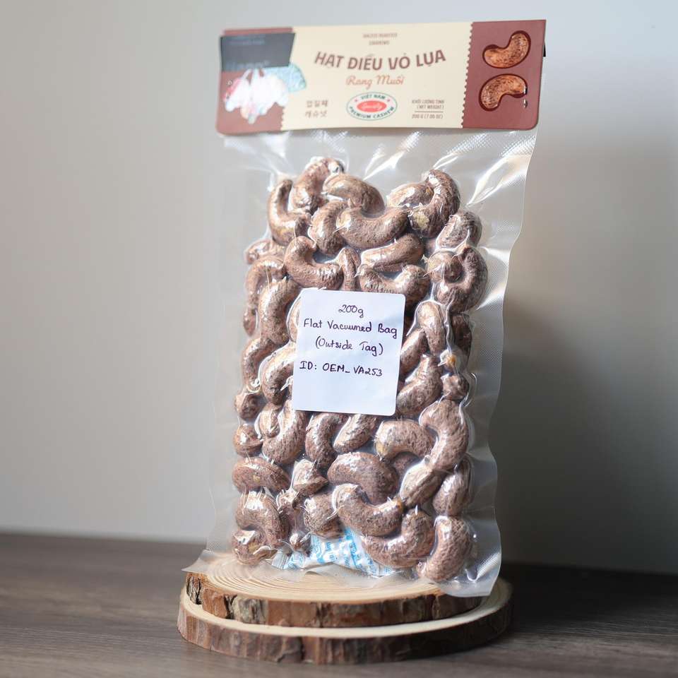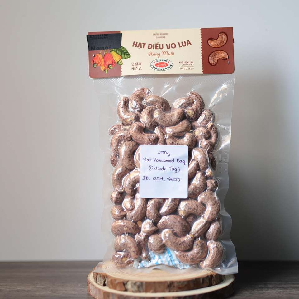เม็ดมะม่วงหิมพานต์อบออร์แกนิกระดับพรีเมียม น้ำหนัก 200 กรัม บรรจุภัณฑ์สุญญากาศ รสเนยและรสเค็ม ผลิตในเวียดนาม อายุการเก็บรักษา 12 เดือน ปรับแต่งได้ตามต้องการ
