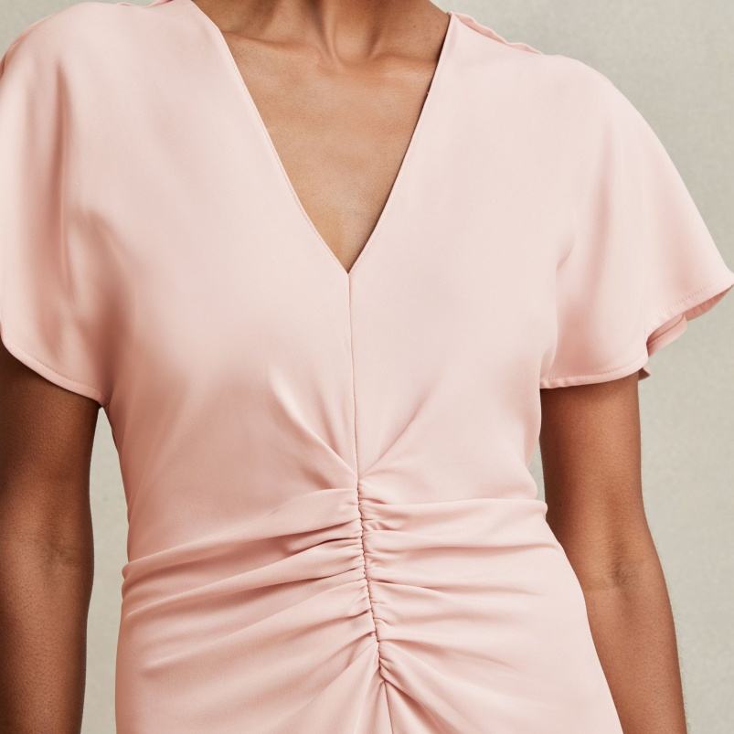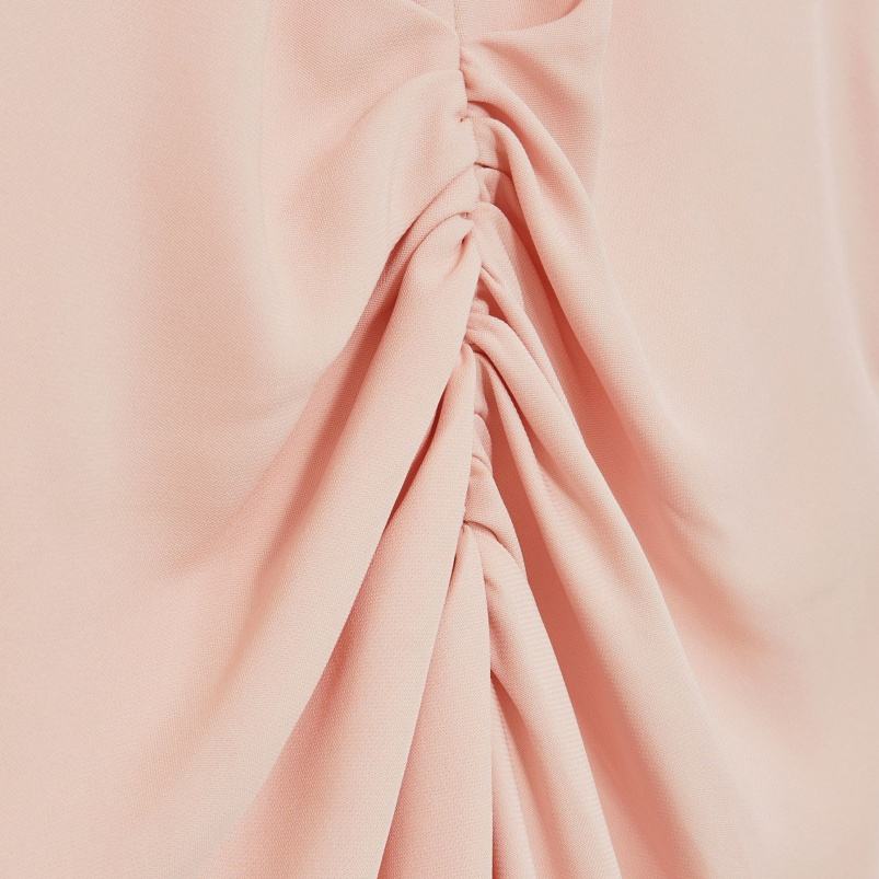 ชุดเดรสยาวคลุมเข่าลำลองของผู้หญิงสีชมพูอ่อนปรับแต่งได้ชุดเดรสยาวคลุมเข่าแนวธรรมชาติตกแต่งกระดุมแบบหวานแต่งได้ทุกวัน