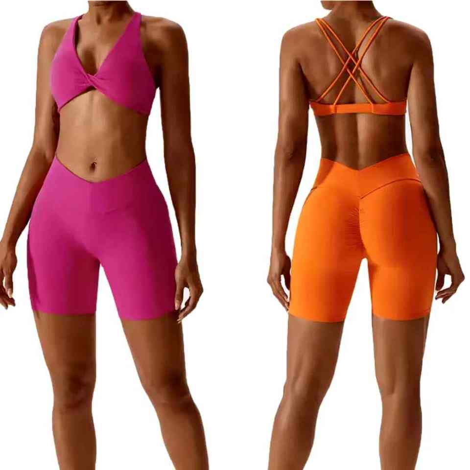 ชุดโยคะแห้งเร็วแบบปรับแต่งโลโก้ได้ชุดบราเล่นกีฬาแบบไขว้ด้านหลังผ้ายืดหยุ่นและกางเกงขาสั้นแบบไม่มีสายสำหรับใส่วิ่งและออกกำลังกายลายพื้น