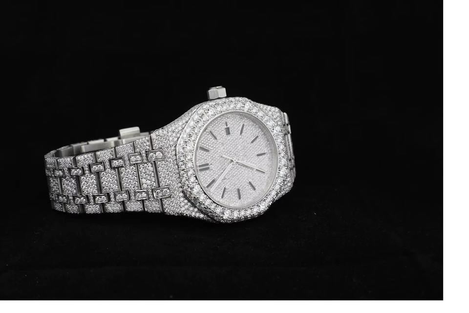 นาฬิกาข้อมือแฟชั่นธุรกิจหรูหราปรับแต่งได้ ประดับเพชรโมอิสซาไนต์ ความใส VVS ระบบควอตซ์ หน้าปัดคริสตัลแซฟไฟร์