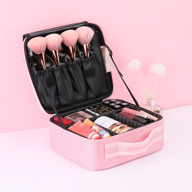 กระเป๋าเครื่องสำอางแบบปรับแต่งได้พร้อมตัวแบ่งที่ถอดออกได้ กระเป๋าจัดระเบียบเครื่องสำอางพกพาสำหรับเดินทาง สีพื้น ปิดด้วยซิป หูหิ้วนุ่ม
