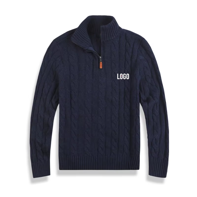 Customizable Men's Cotton-Blended Pullover Sweater Zipper up Cable Knitted with Turtle Neck Embroidery Logo