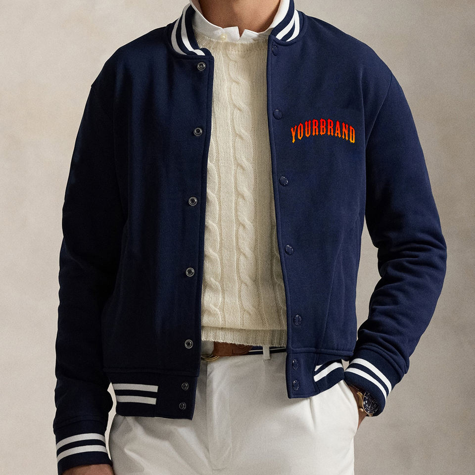 เสื้อแจ็กเก็ตทีมโรงเรียนของผู้ชายผ้าวูล100% คุณภาพสูงผ้าวูลสีกรมท่าปักโลโก้ยาว