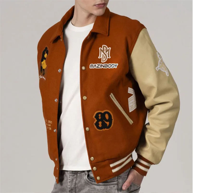 แจ็กเก็ตเลตเตอร์แมนสำหรับผู้ชายและผู้หญิงปรับแต่งได้เสื้อแจ็กเก็ตเบสบอลคอตั้งลายผ้ากำมะหยี่ปักตามสั่ง