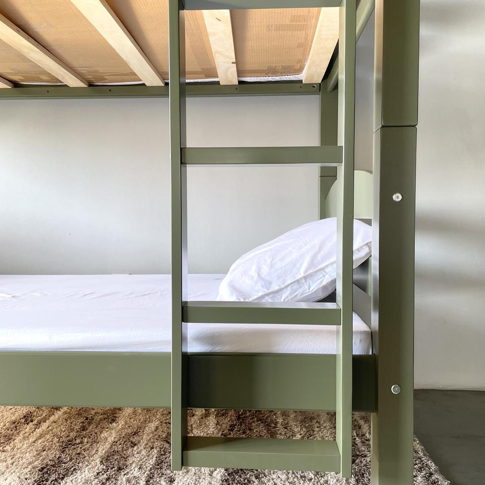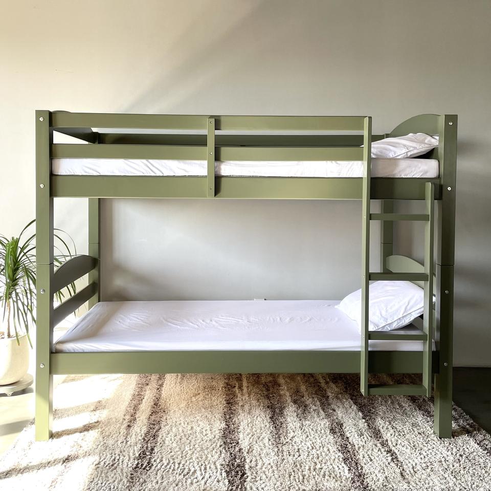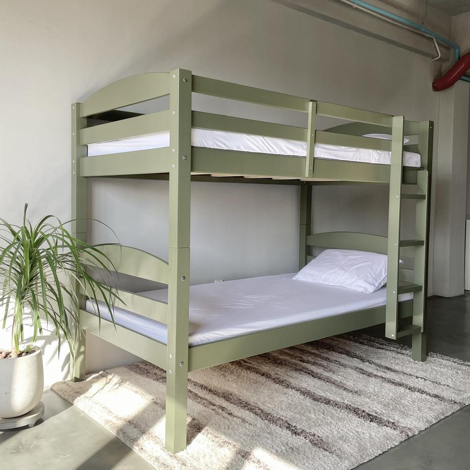 เตียงสองชั้นสีเขียวมะกอกแบบมินิมอลปรับแต่งได้ เฟอร์นิเจอร์ห้องนอนไม้สั่งทำสำหรับเด็ก