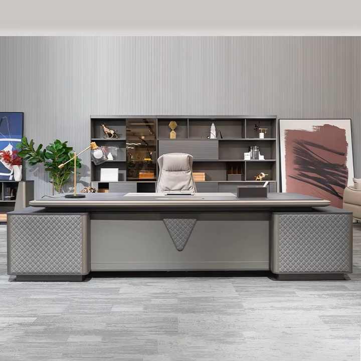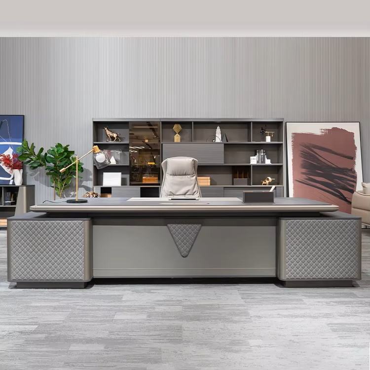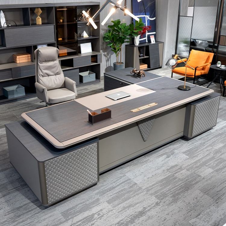 HMS โต๊ะทำงานสีน้ำตาลเข้มทันสมัยตามหลักสรีรศาสตร์พร้อมที่เก็บของที่ทันสมัยวัสดุแผ่นหรูหราสำหรับห้องนอนสำนักงานเฟอร์นิเจอร์ในบ้าน