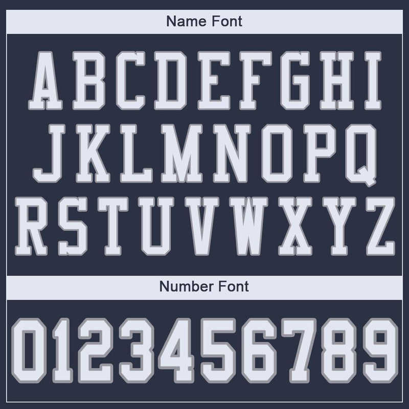 เสื้อฟุตบอลอเมริกันสีน้ำเงินกรมท่าสำหรับผู้ชายไซส์พลัส ปรับแต่งได้ แต่งสีเทาขาว ผ้าตาข่ายโพลีเอสเตอร์ระบายอากาศ พร้อมสกรีนชื่อส่วนตัว