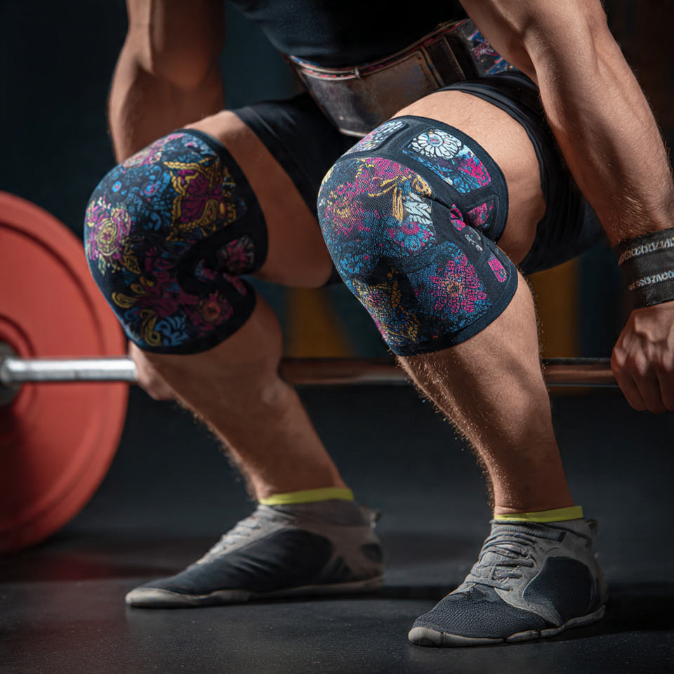 ปลอกเข่าพิมพ์ลายนีโอพรีนแบบปรับแต่งได้ สำหรับยกน้ำหนักและเพาเวอร์ลิฟติ้ง ระบายอากาศได้ดี ไม่ลื่น ช่วยพยุง