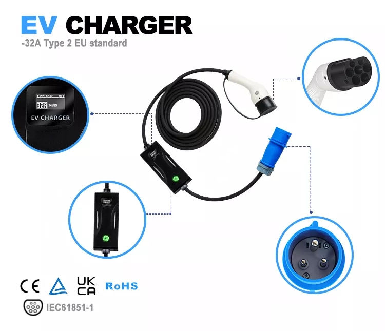 เครื่องชาร์จ EV แบบพกพาปรับแต่งได้ปรับแต่งได้สภาพใหม่โหมด Type2 6A ชาร์จไฟฟ้ากระแสสลับ2 EV 8A 10A 13A 16A 32A