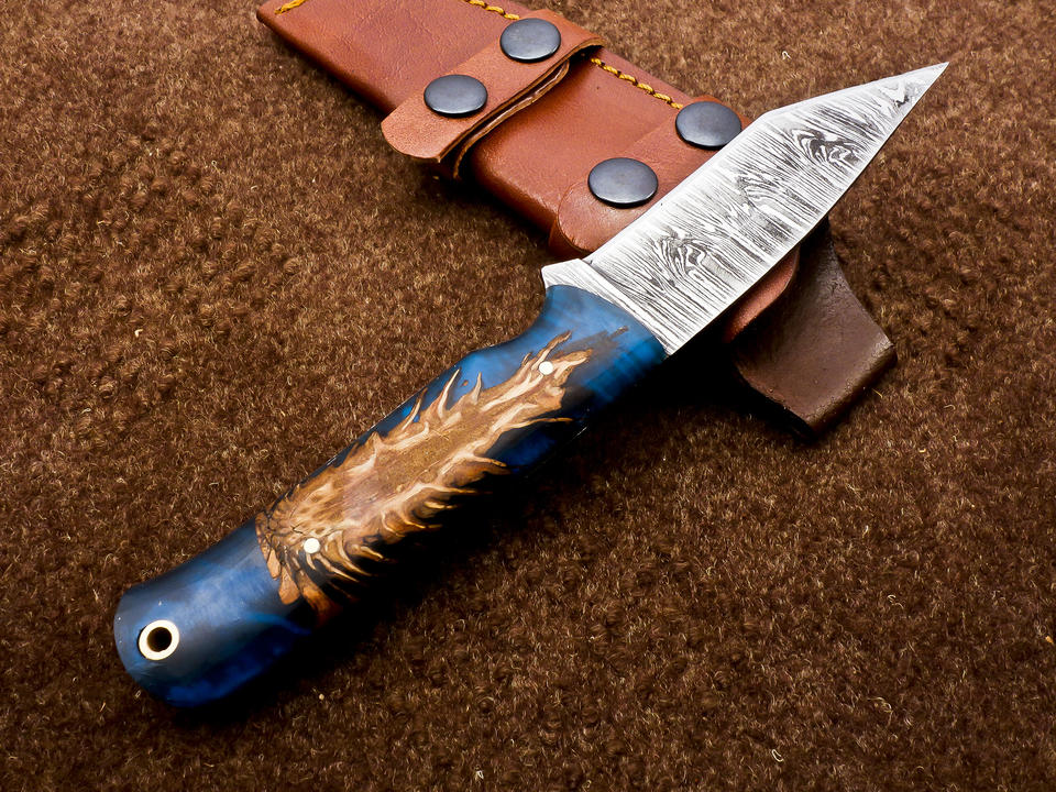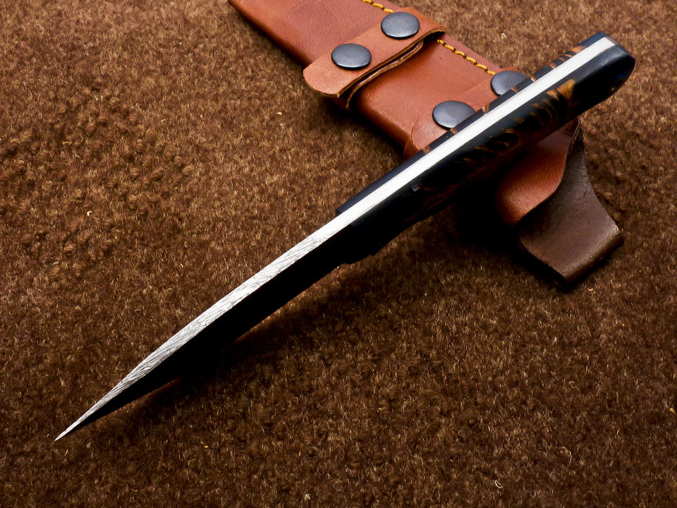 มีดล่าสัตว์และตั้งแคมป์แบบใบตายเหล็กดามัสกัสสไตล์นอร์ดิก ปรับแต่งได้ ผลิตตามแบบ OEM ขนาด 8 นิ้ว ด้ามเรซิ่นลายโคนสน พร้อมปลอกพกพา