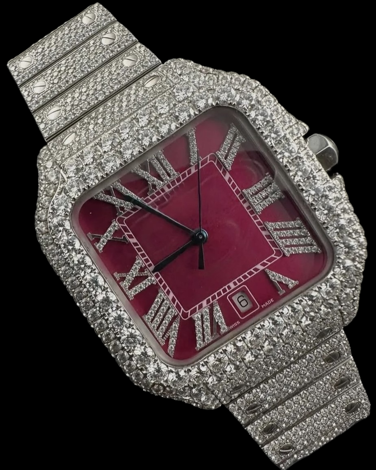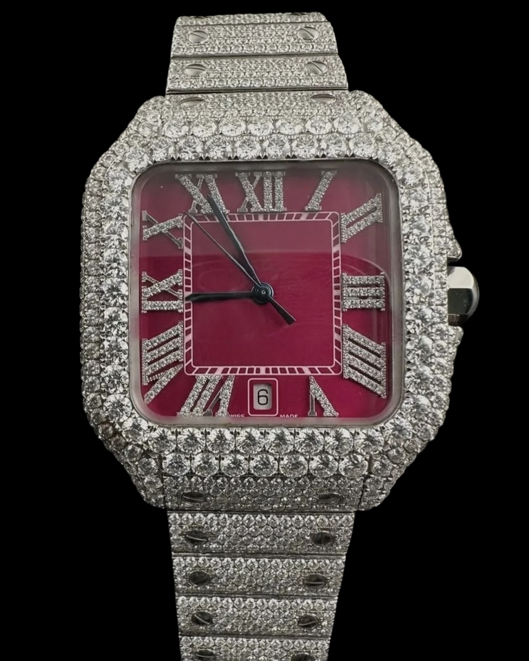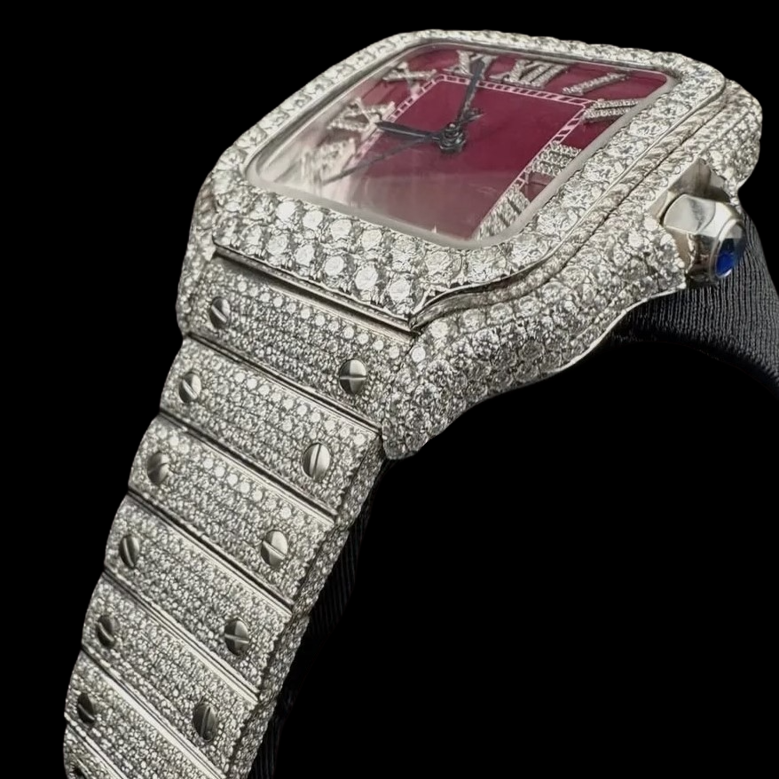 นาฬิกาข้อมือผู้ชายสุดหรู ดีไซน์ฮิปฮอป หน้าปัดสีแดงปรับแต่งได้ ประดับเพชรโมอิสซาไนต์เต็มหน้าปัด ตัวเลขโรมัน สวยงาม