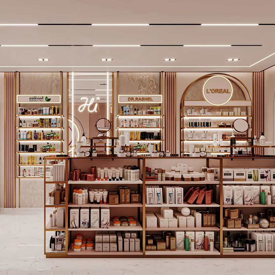 ชั้นวางสินค้าเครื่องสำอางแบบปรับแต่งได้สำหรับร้านค้าปลีก | เฟอร์นิเจอร์ร้านเครื่องสำอางสมัยใหม่และดีไซน์ตู้ไม้สำหรับเครื่องสำอาง