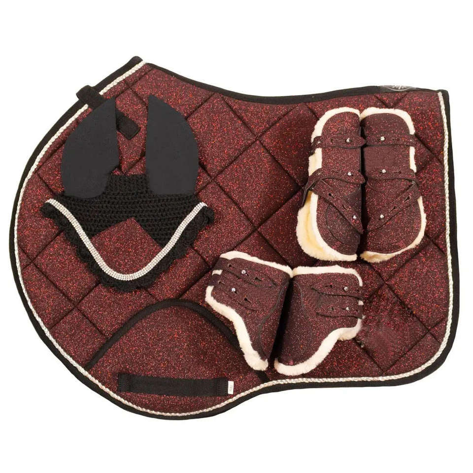 ชุดแผ่นรองอานม้าม้าสีแดงแวววาวปรับแต่งได้ชุดเดรสกระโดดผ้านุ่มสบายซับในอุปกรณ์ขี่ม้า
