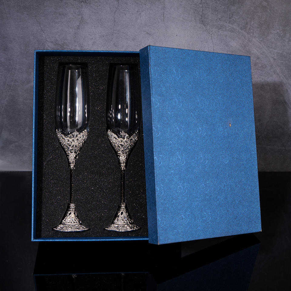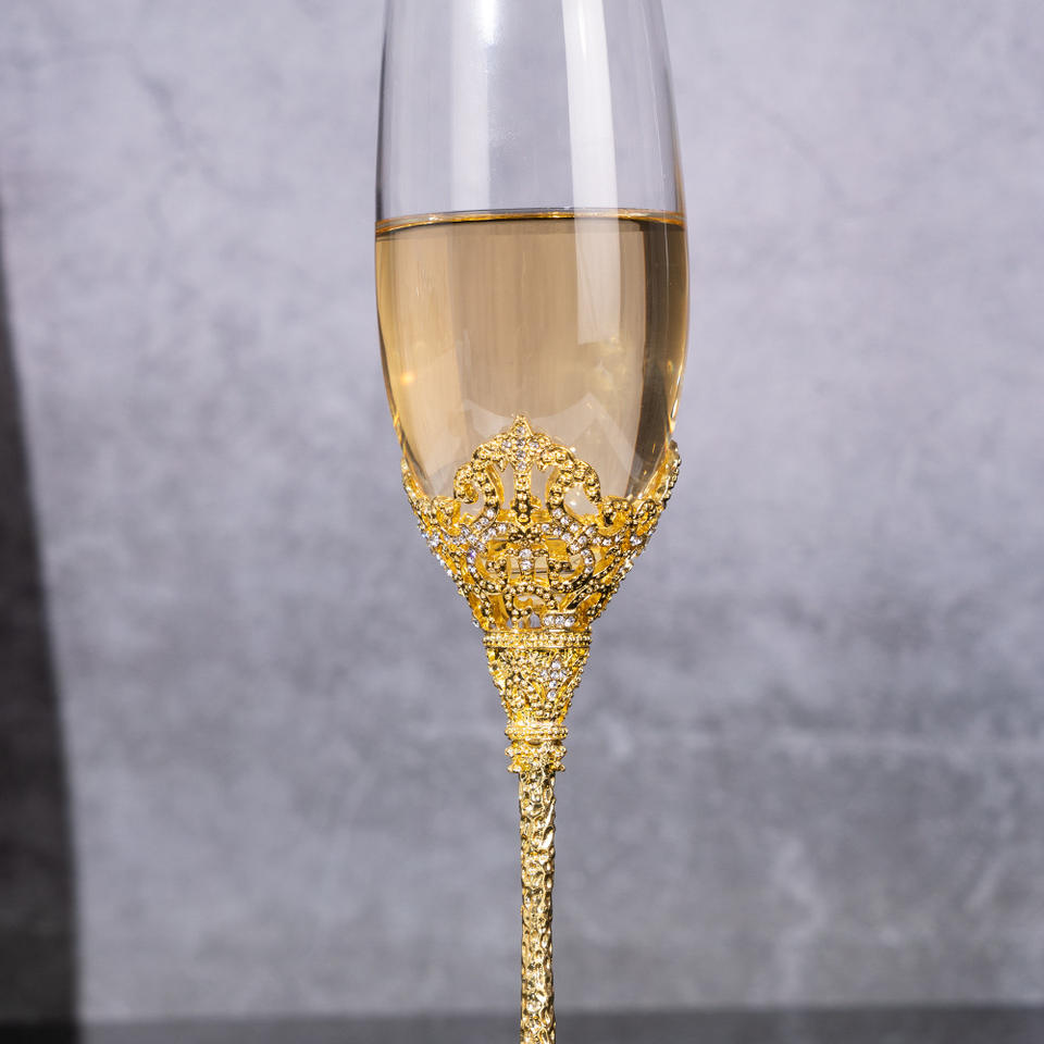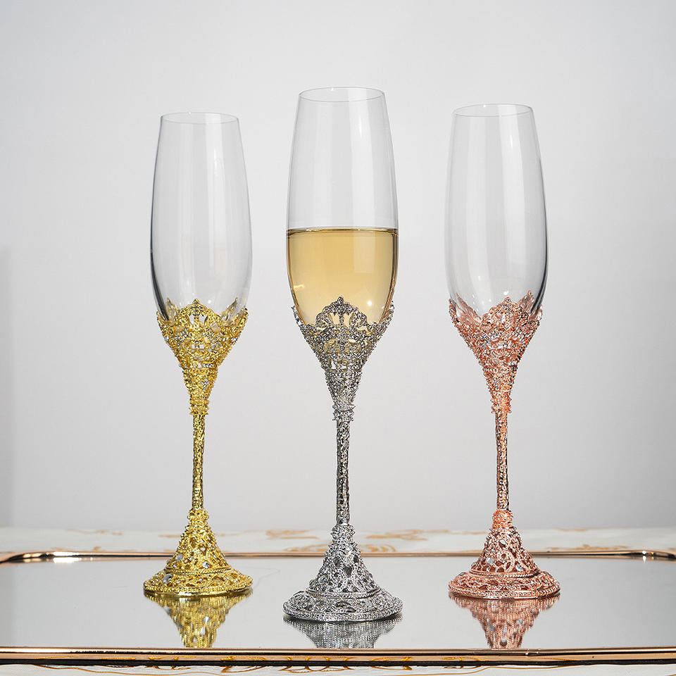 แก้วฟลุตแต่งงานแบบปรับแต่งได้ สีเงิน สีโรสโกลด์ ประดับเพชร ฐานโลหะผสมสังกะสี ปลอดสาร BPA แก้วนิรภัย หรูหรา