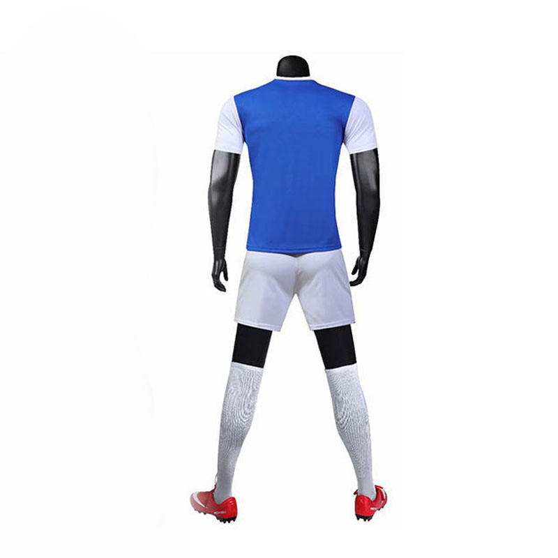 ชุดเสื้อฟุตบอลสีขาวและสีน้ำเงินชุดฝึกฟุตบอลผ้าระบายอากาศสำหรับคลับเสื้อทีมพร้อมกางเกงขาสั้น