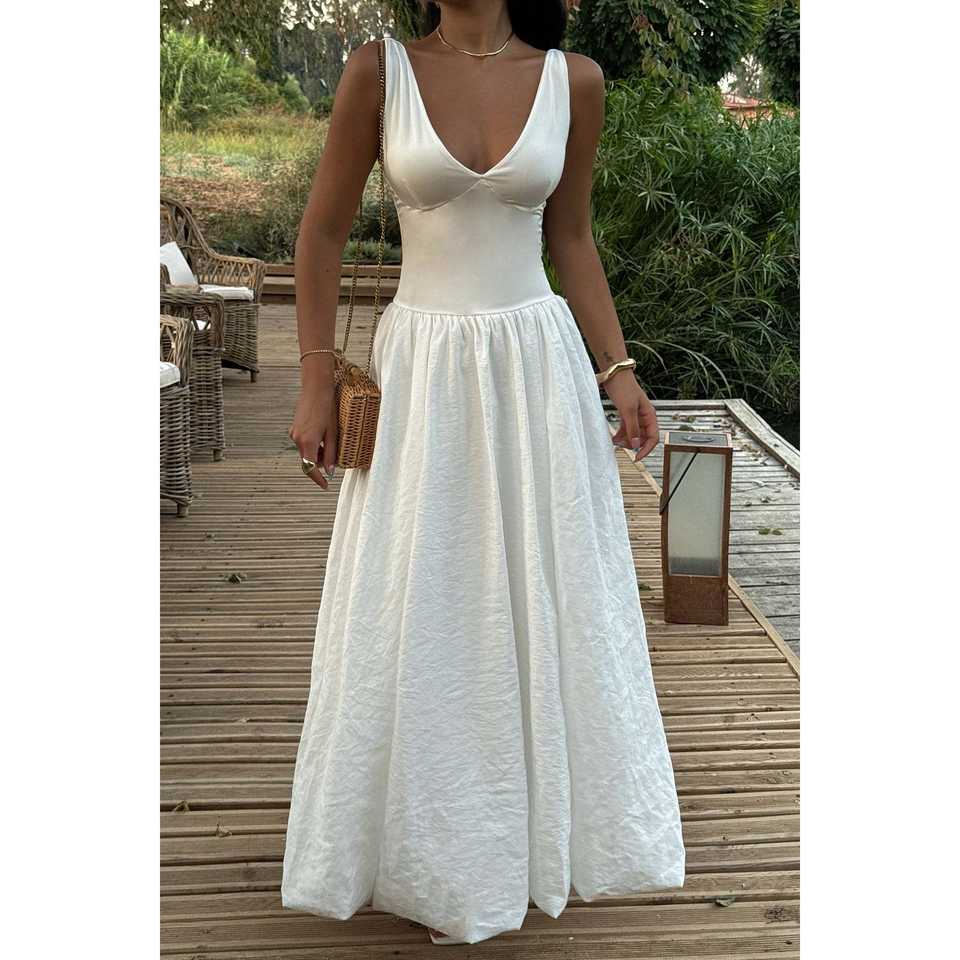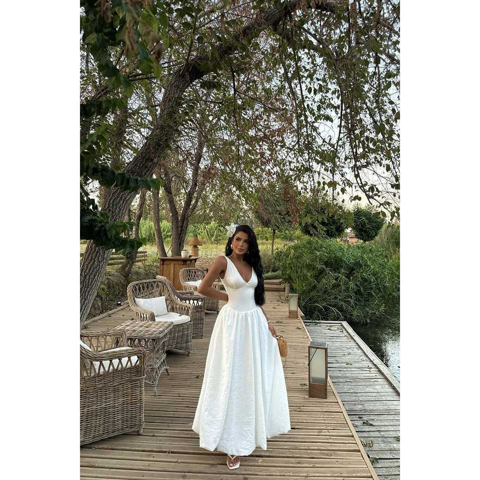 ชุดเดรสสายเดี่ยวสีขาวปรับแต่งได้ ผ้ายืดสูง ทรงคอ halter เอวต่ำ สไตล์วินเทจ หรูหรา เหมาะสำหรับงานปาร์ตี้ คลับ หรือวันหยุด ไซส์ XS-XL พร้อมซับใน