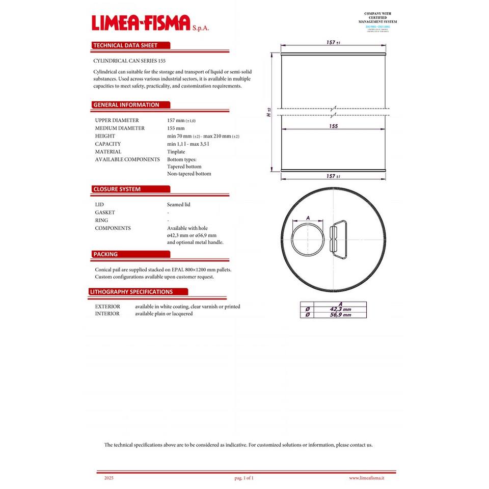 กระป๋องดีบุกทรงกระบอกขนาด155มม. ปรับแต่งได้มีความจุรวมตั้งแต่2,6ถึง3,5 lt. พร้อมที่จับและรูเท