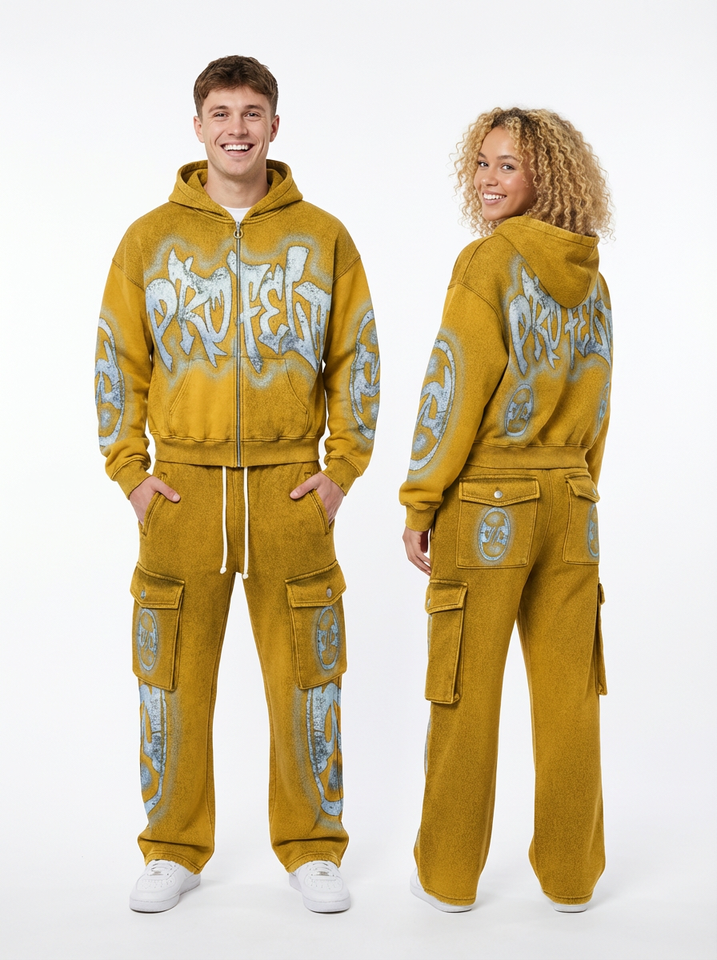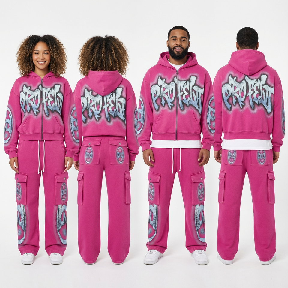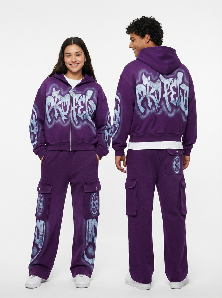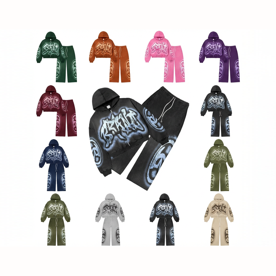 ชุดเซ็ตสองชิ้นแบบสั่งทำพิเศษ เสื้อฮู้ดพิมพ์ลายกราฟฟิตี้ พร้อมกางเกงคาร์โก้ขายาวทรงกว้าง ผ้าฟลีซเนื้อหนา