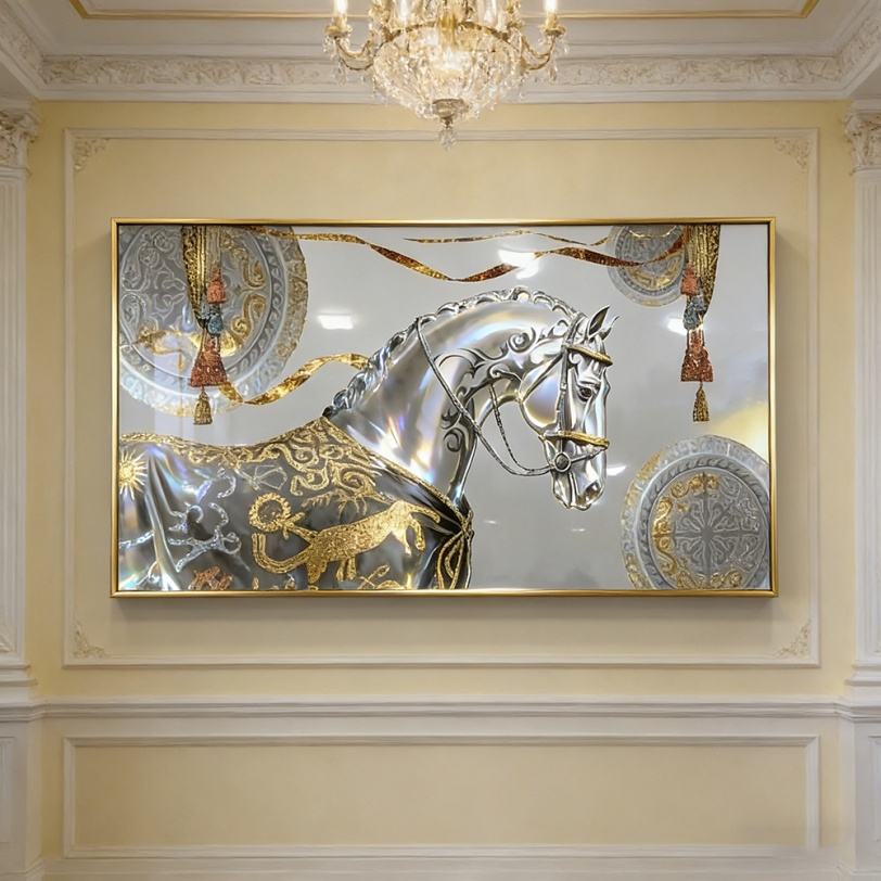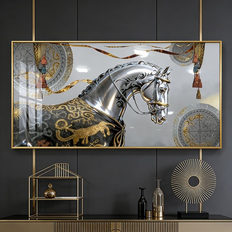 Customization Home Decoration Large Size Livingroom White Horse Pictures Crystal Porcelain Painting Glass Led Wall Art Painting