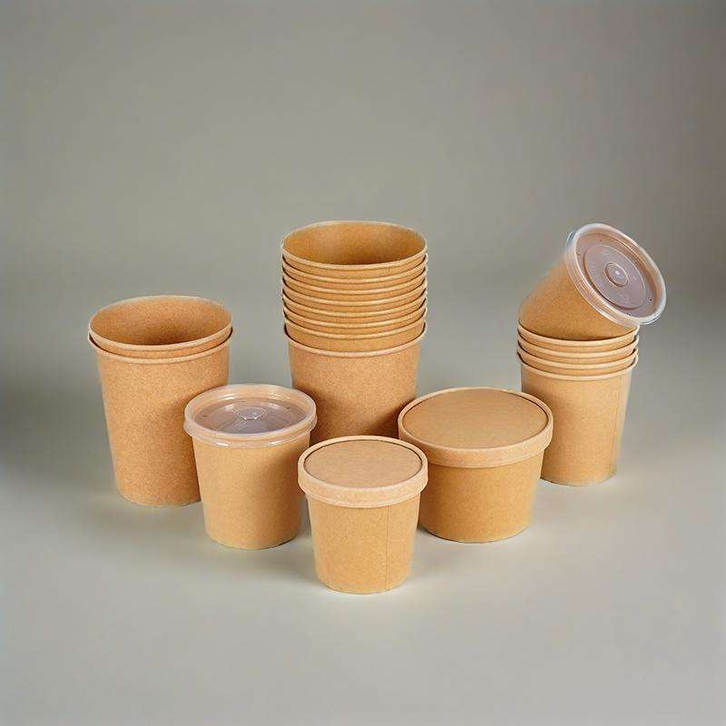 ถ้วยซุปกระดาษสีขาวกระดาษคราฟท์แบบใช้แล้วทิ้งพร้อมฝาปิดกระดาษ