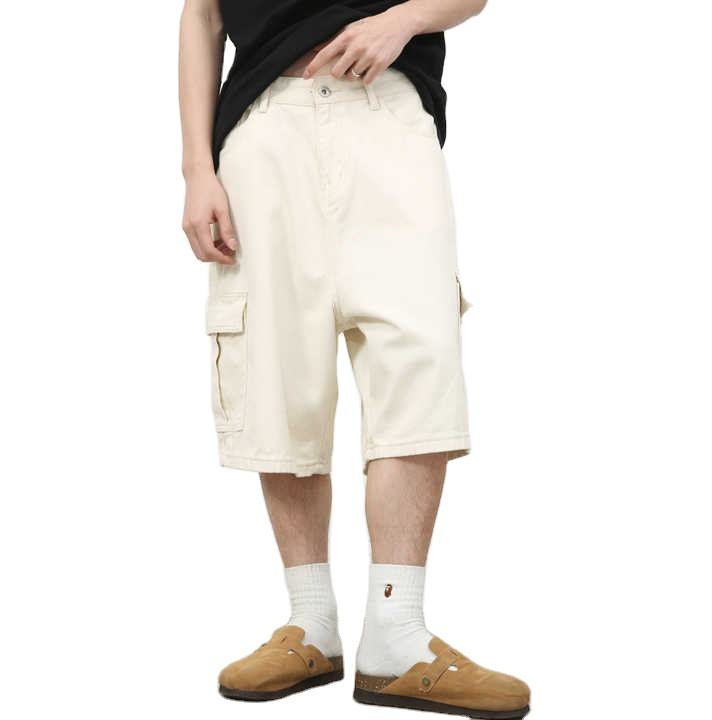 กางเกงยีนส์ขาสั้นแบบลำลองสำหรับผู้ชายกางเกงขาสั้นทรงหลวมขากว้างมีกระเป๋าปรับแต่งได้สำหรับฤดูร้อน