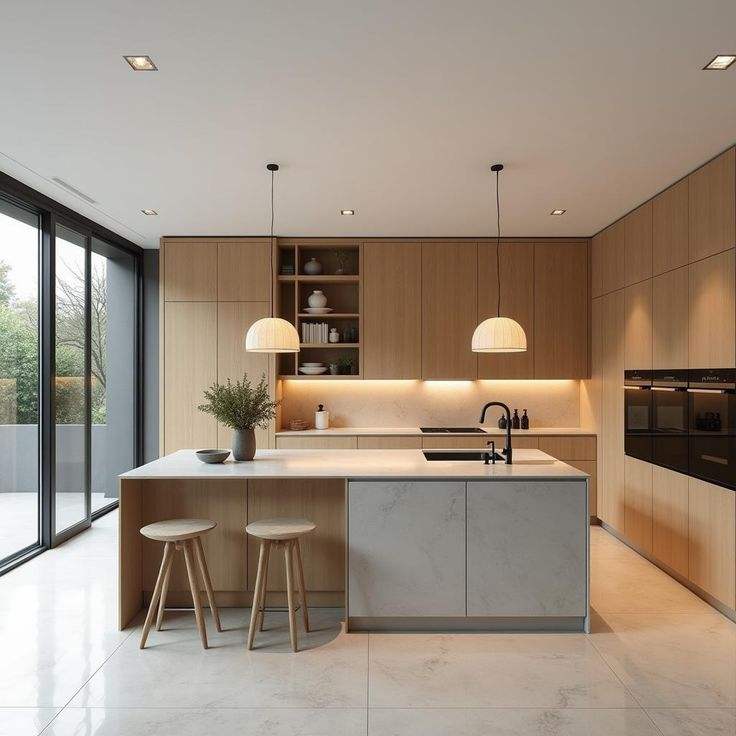 การปรับแต่งตู้ครัวทันสมัยทำจากไม้เคาน์เตอร์หินเผาพร้อมอ่างล้างจานบนโต๊ะเกาะในห้องครัว