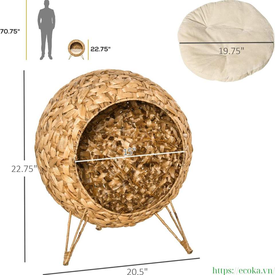 ที่นอนแมวทรงสี่เหลี่ยมผืนผ้าขนาด 20.5 นิ้ว ทำจากใบตองถักมือ พร้อมเบาะรองนอน บ้านแมวแบบยกพื้น บรรจุภัณฑ์กล่อง ผลิตในเวียดนาม