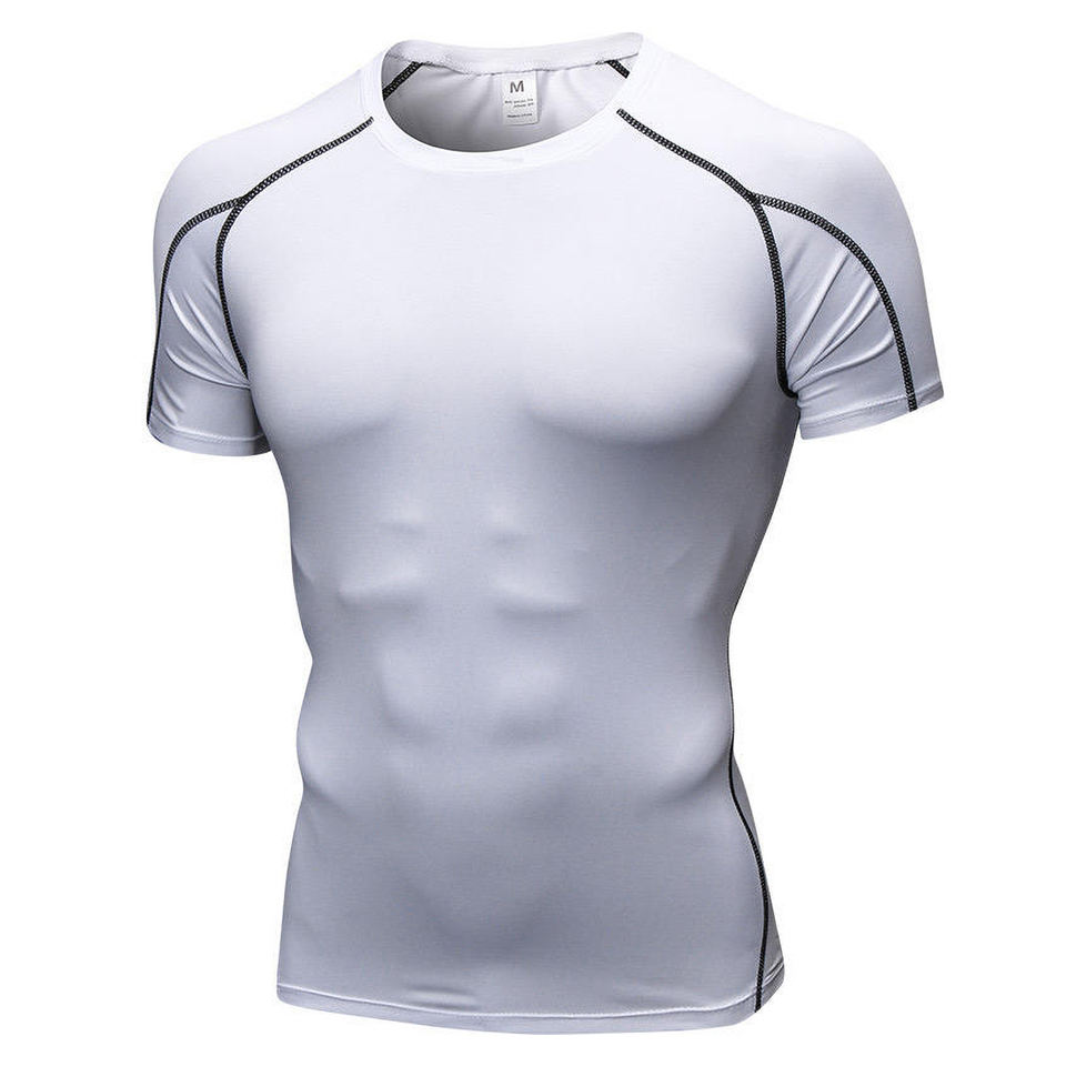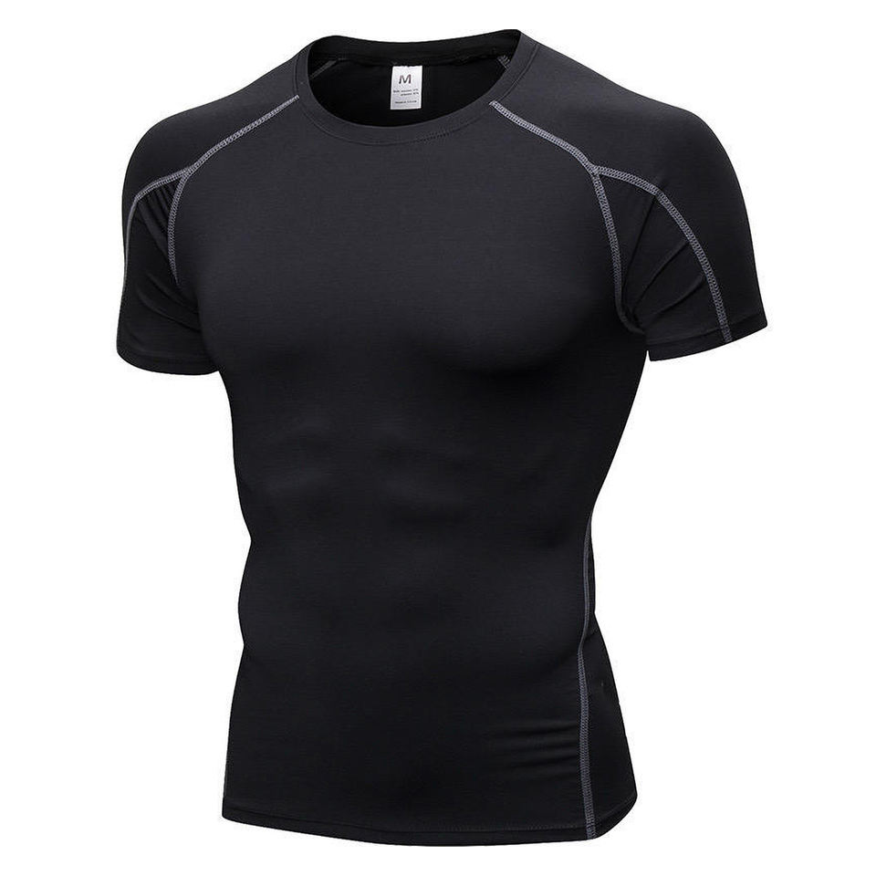 เสื้อยืดรัดรูปของผู้ชายผ้าโพลี-สแปนเด็กซ์ป้องกันผื่นครึ่งแขนสีดำปรับแต่งประสิทธิภาพในยิมแห้งเร็ว