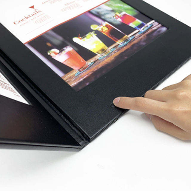 สมุดเมนูหนัง PU สีดำแบบกำหนดเอง พร้อมเมนูดิจิทัลสองหน้าแบบมีไฟ ขนาด A4 A5 ที่ใส่เมนูร้านอาหาร คุณภาพสูง