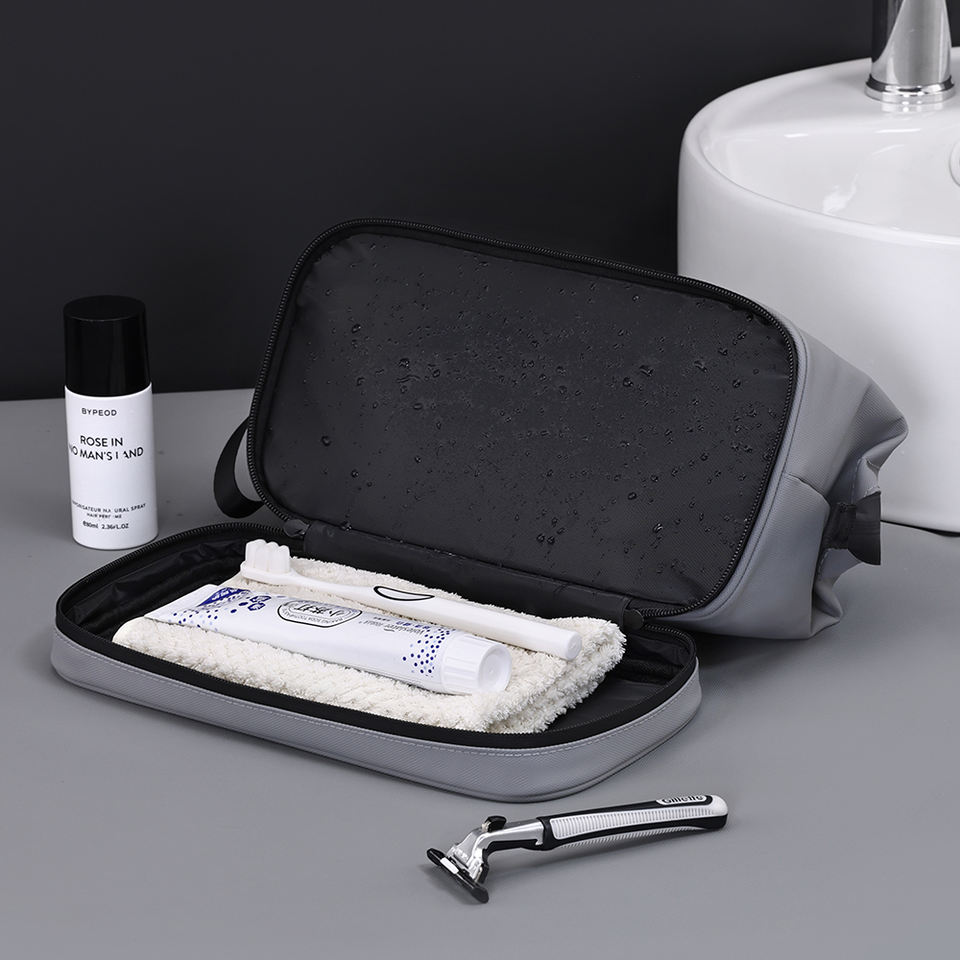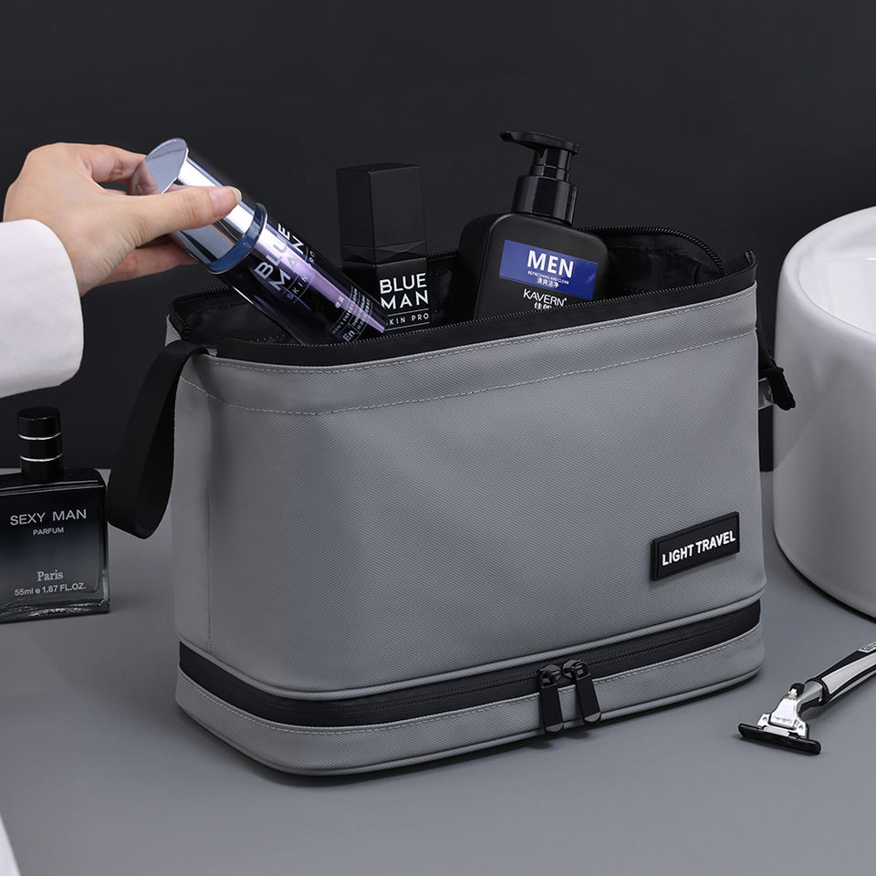 กระเป๋าเครื่องสำอางสองชั้นสำหรับเดินทางกระเป๋าเครื่องสำอางกันน้ำพกพาสีดำสีเทากระเป๋าจัดระเบียบสำหรับผู้ชายปรับแต่งได้