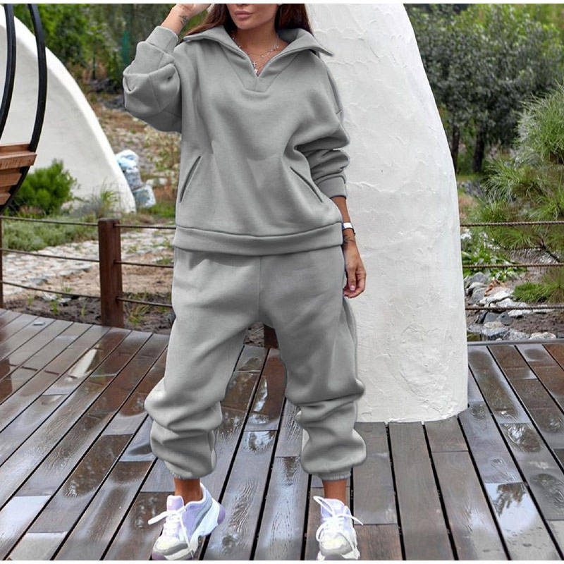 ชุดวอร์มผู้หญิงแบบมีฮู้ดครอปและกางเกงขายาวทรงตรง ผ้าฟลีซ ปรับแต่งโลโก้ได้