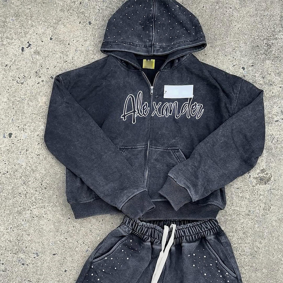 เสื้อมีฮู้ดของผู้ชายแบบวินเทจผ้าเกล็ดปลาสกรีนซีดจางพิมพ์ลายเฮฟวี่เวทผ้าฝ้ายเทอร์รี่ประดับพลอยเทียมมีฮู้ดสำหรับผู้ชาย
