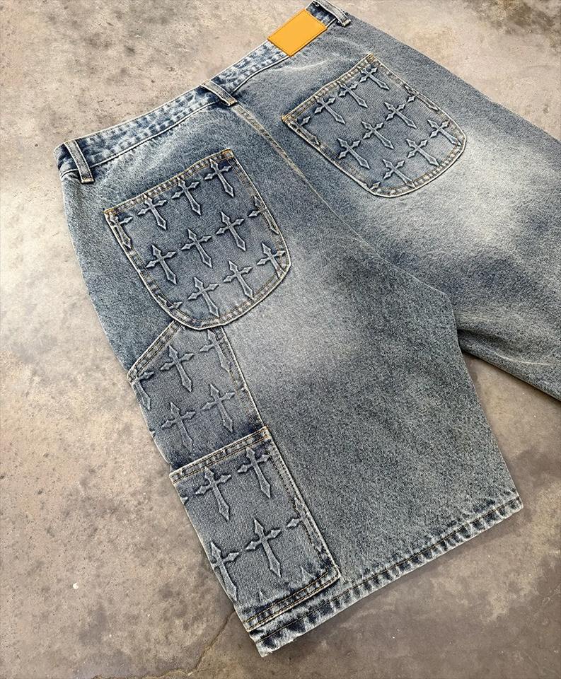 กางเกงขาสั้นผ้ายีนส์แบบปรับแต่งแนวสตรีทสำหรับผู้ชายกางเกงขาสั้นผ้ายีนส์ทรงหลวมลายนูนที่หัวเข่าสองชั้นดีไซน์สำหรับผู้ชาย