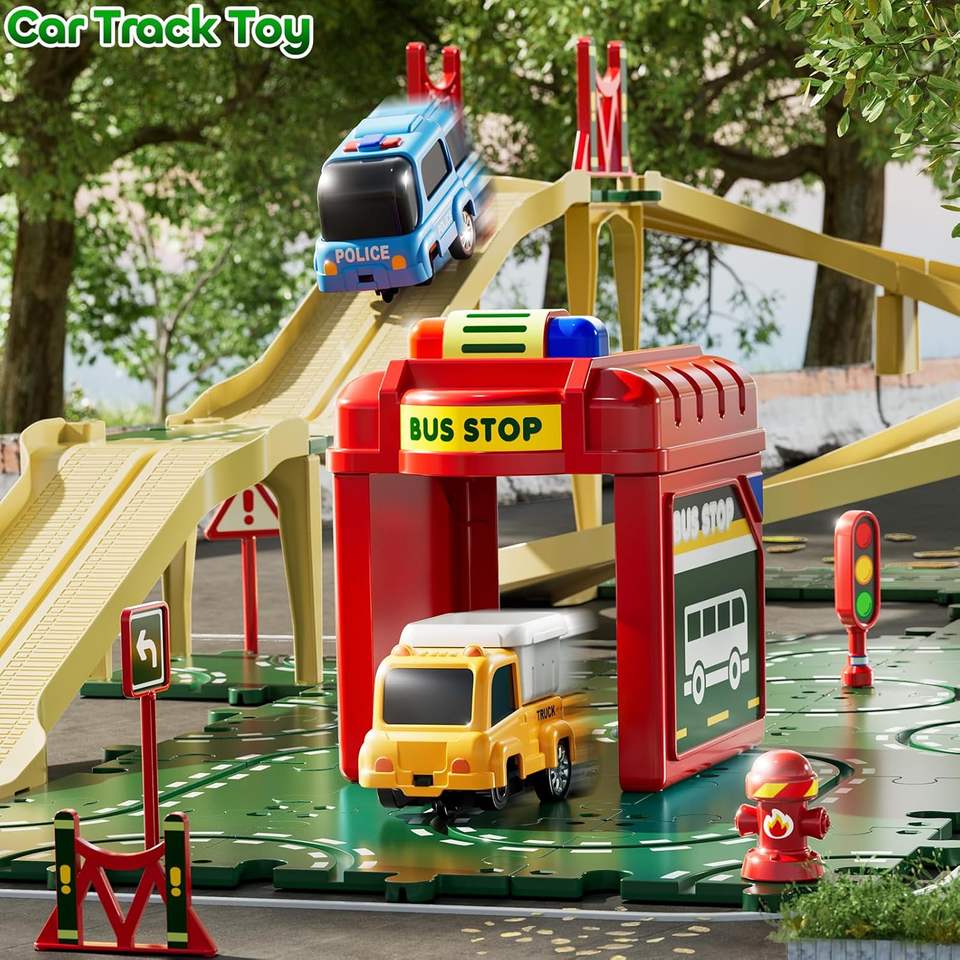 ชุดรางรถแข่งปรับแต่งได้สำหรับเด็ก ชุดรางรถแข่ง 4 ชั้น สำหรับเด็กอายุ 2-5 ปี พร้อมรถ 3 คัน ชิ้นส่วนจราจร ปริศนาต่อพื้น