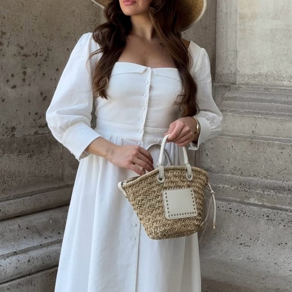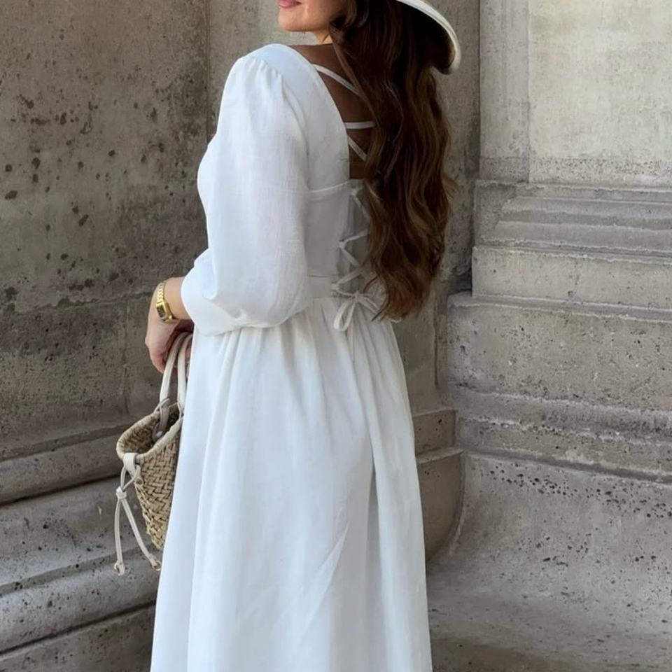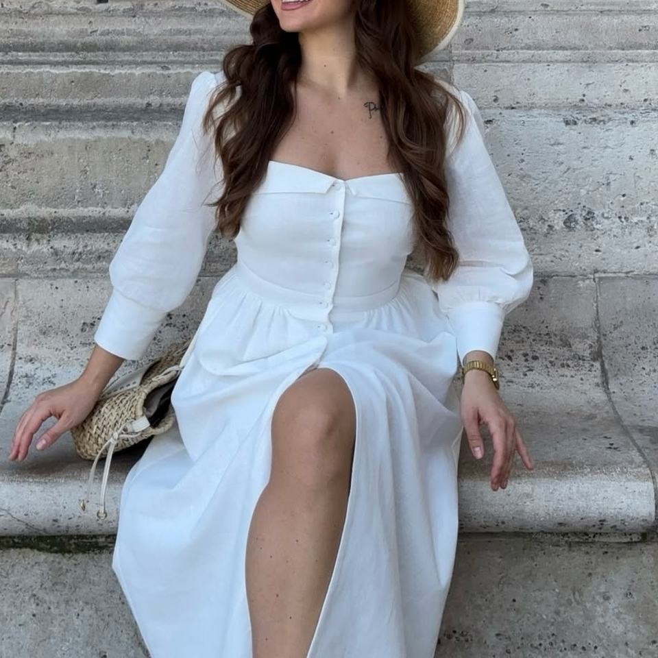 ชุดเดรสผ้าฝ้ายลินินลายดอกไม้เก๋ไก๋ ปรับแต่งได้ตามต้องการ คอเหลี่ยม แขนยาวทรงเอ กระดุมผ่าหน้า ความยาวปานกลาง สไตล์ลำลองสำหรับฤดูร้อน