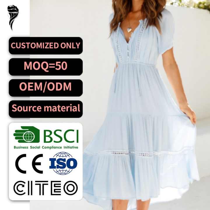 ชุดเดรสฤดูร้อนทรงเอ สไตล์ลำลอง คอวี แขนสั้น แต่งระบาย ความยาวปานกลาง สำหรับผู้หญิง ปรับแต่งได้ตามต้องการ