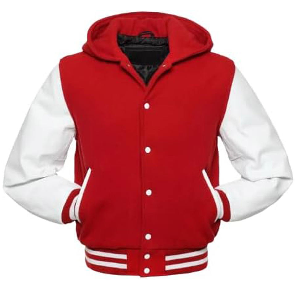 แจ็กเก็ตผ้าขนสัตว์หุ้มด้วยหนังแท้มีฮู้ดแขนเสื้อแจ็คเก็ตเลตเทอร์แมนสำหรับฤดูหนาว