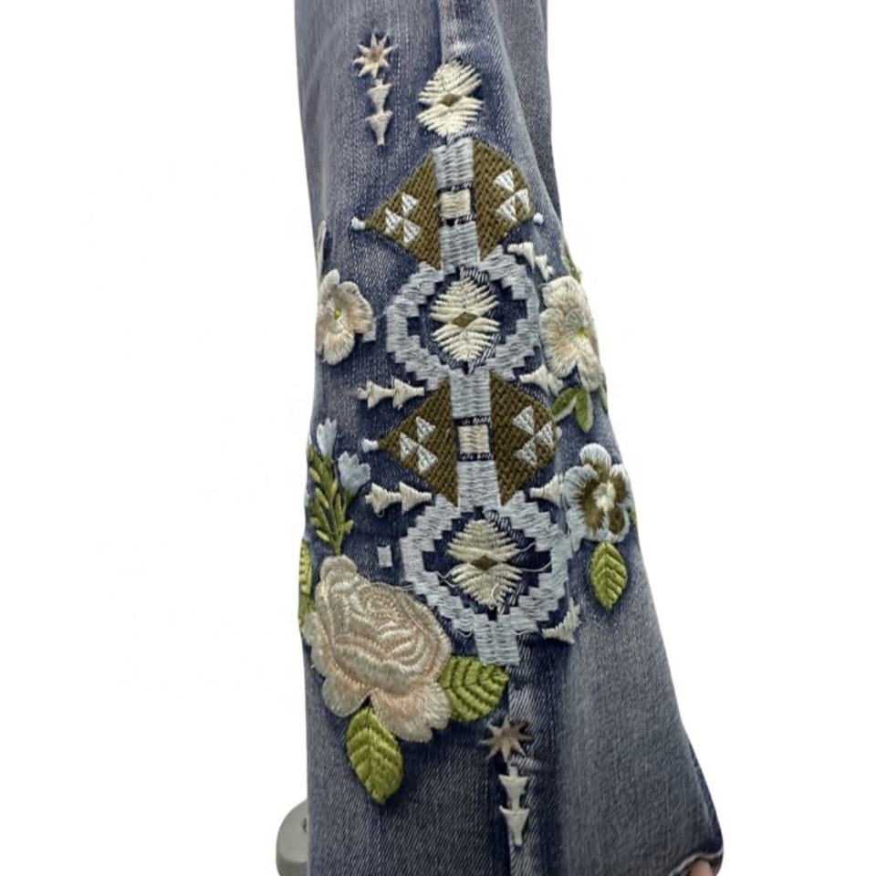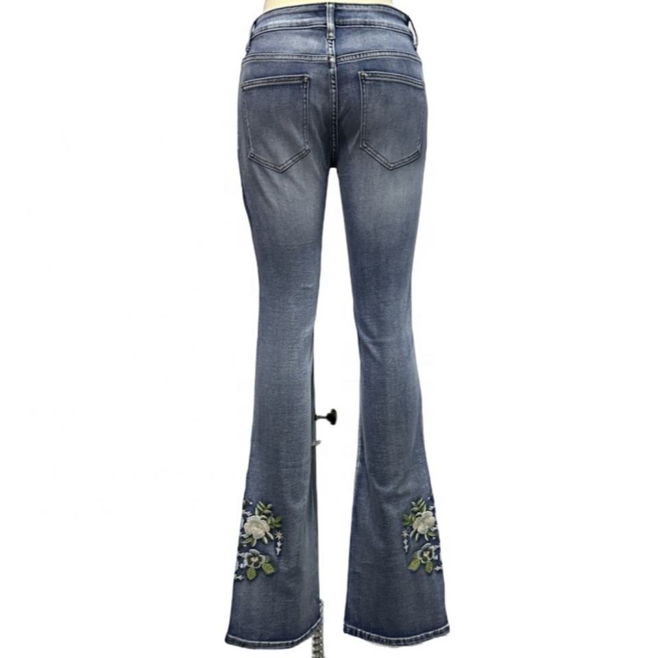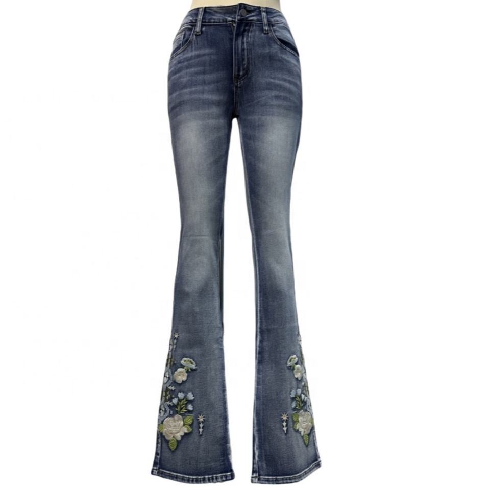 กางเกงยีนส์ทรงขาบานสำหรับผู้หญิง ลายดอกไม้ เอวสูง ทรงสกินนี่ ปักลาย ล้างสีฟ้า