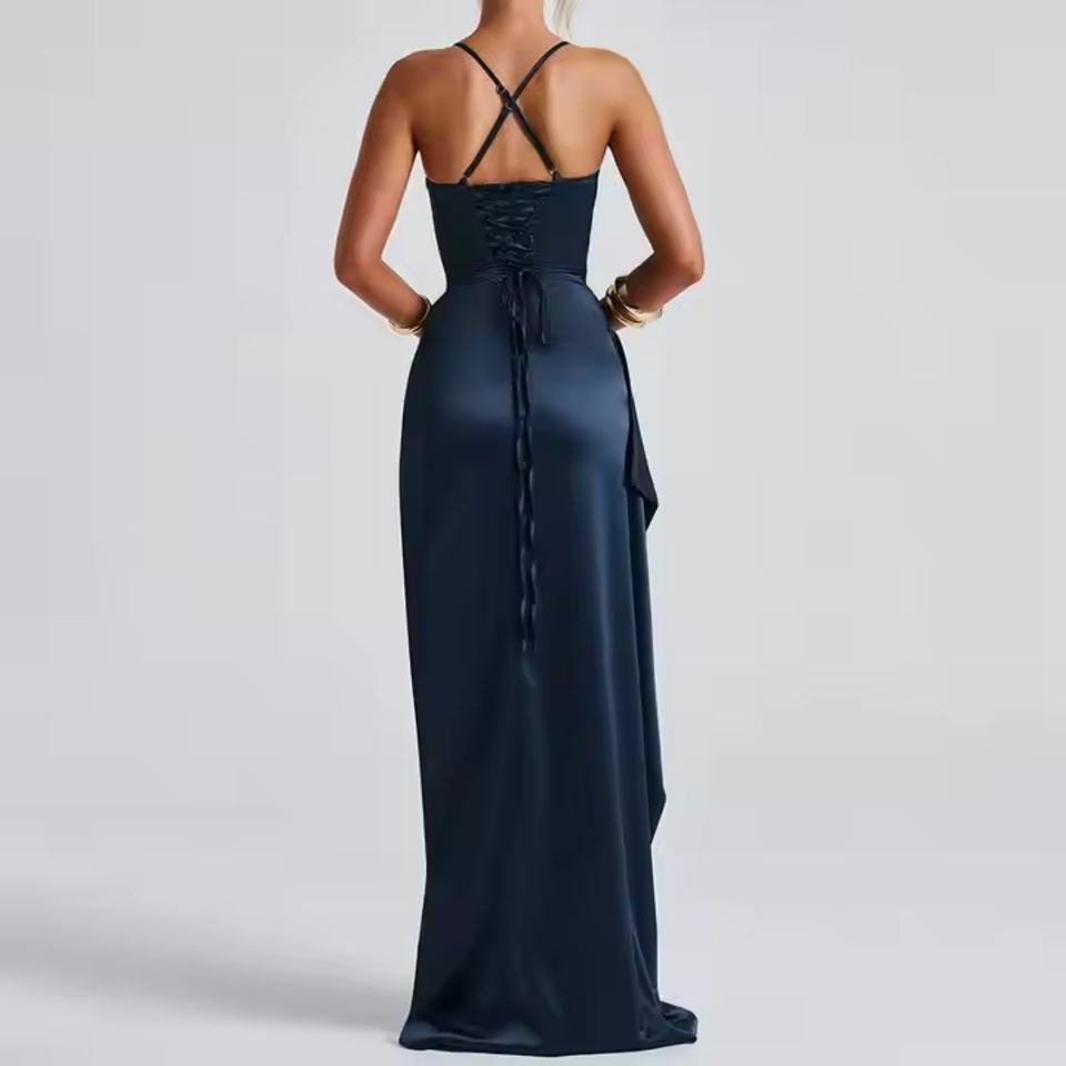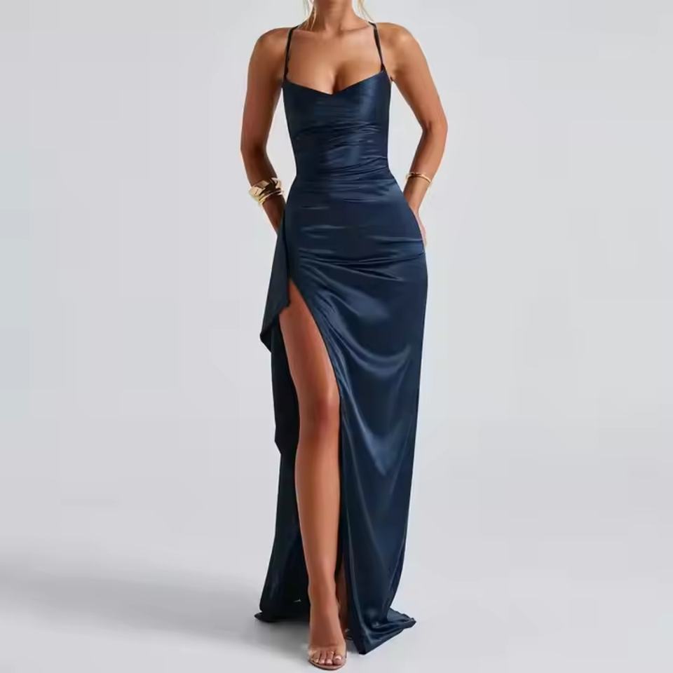 ชุดเดรสผ้าซาตินสำหรับผู้หญิง แบบเปิดหลัง ผ่าข้าง คอวี เซ็กซี่ เหมาะสำหรับงานปาร์ตี้หรืองานพรอม ดีไซน์หรูหรา เรียบร้อย