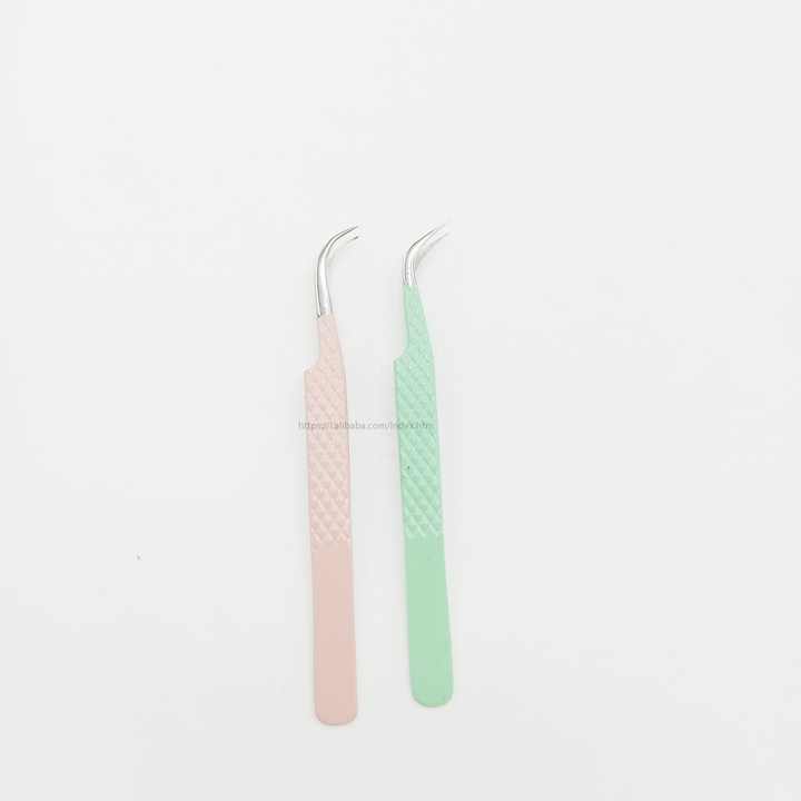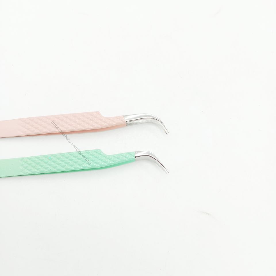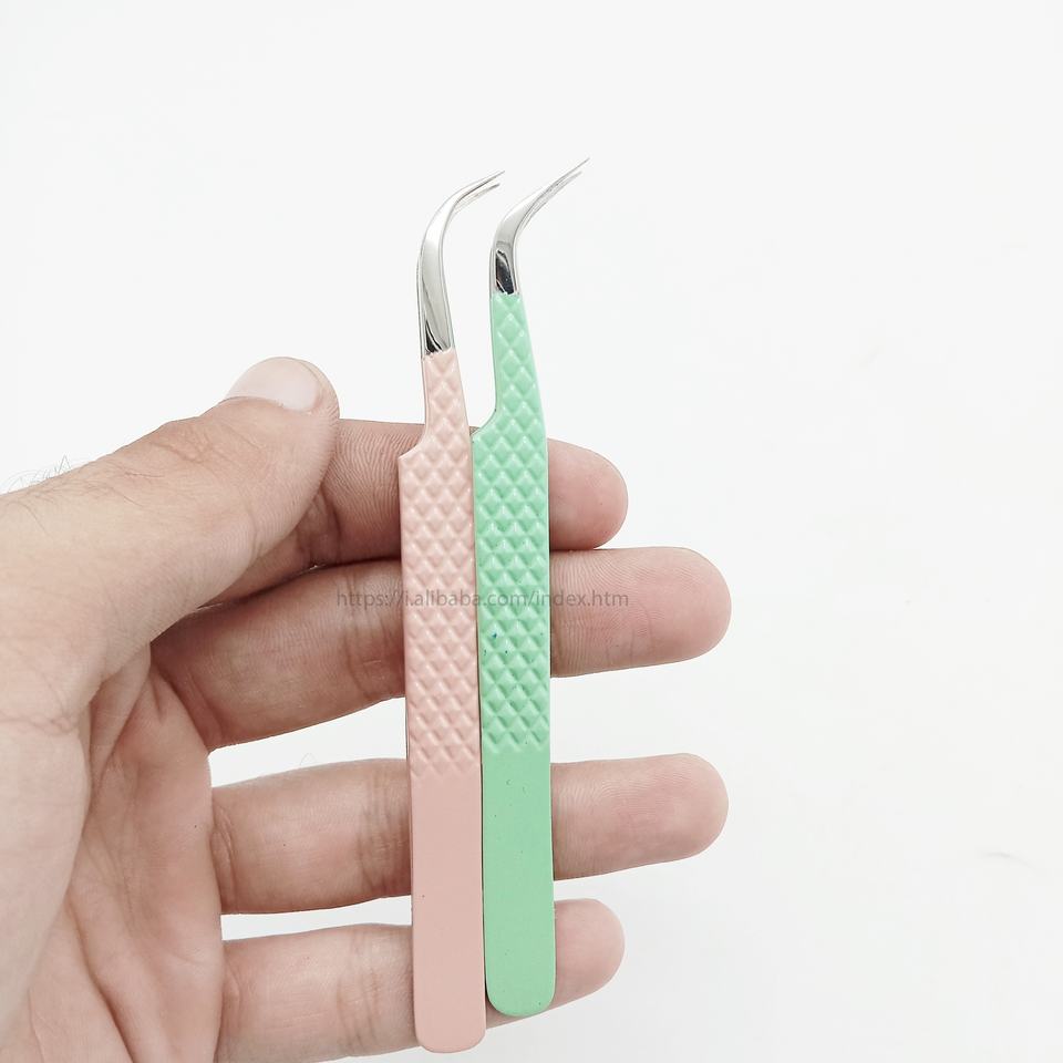 แหนบต่อขนตาแบบปลายเงินสีเขียว90องศาปรับแต่งโลโก้ฉลากส่วนตัว