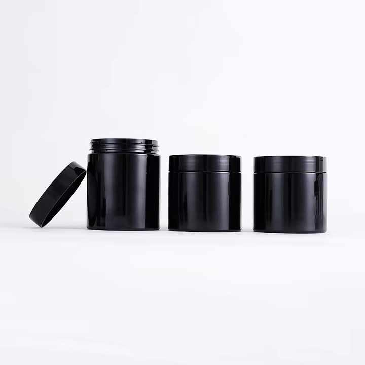 บรรจุภัณฑ์พลาสติก PET สีดำปากกว้าง ขนาด 100 มล., 200 มล., 300 มล., 500 มล. แบบกำหนดเองได้ พร้อมฝาพลาสติก