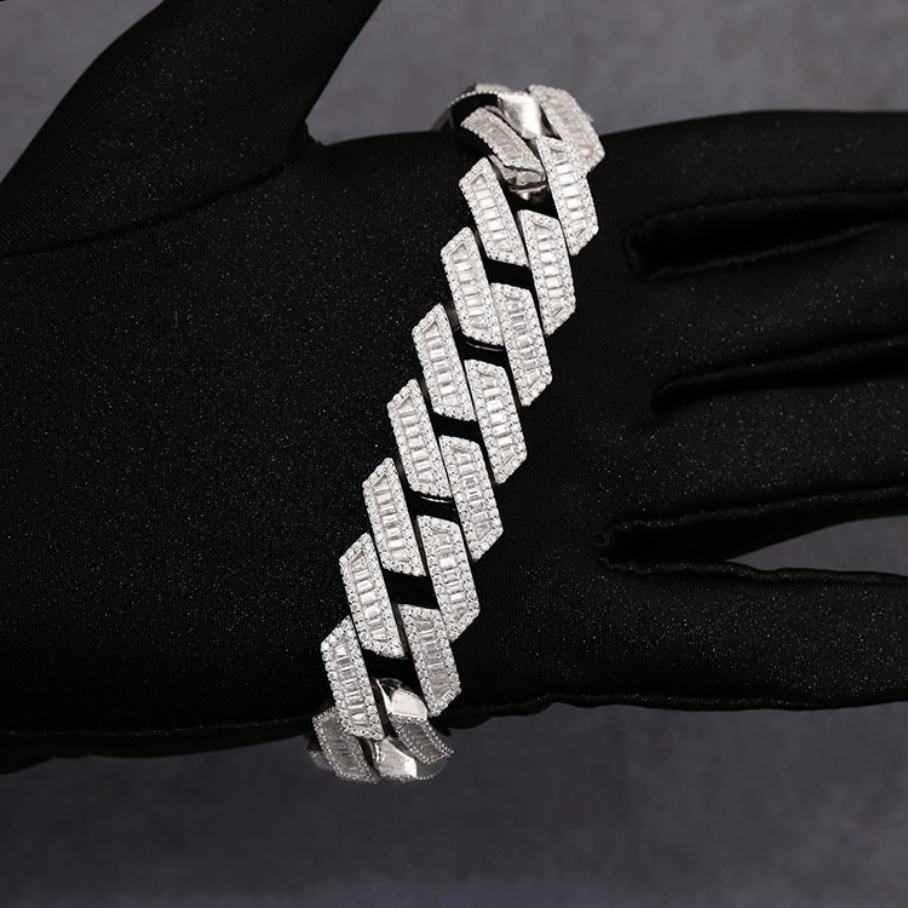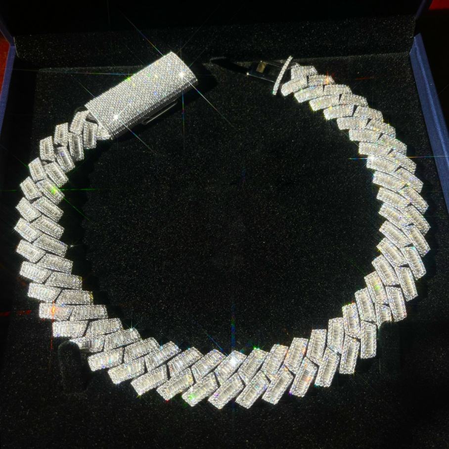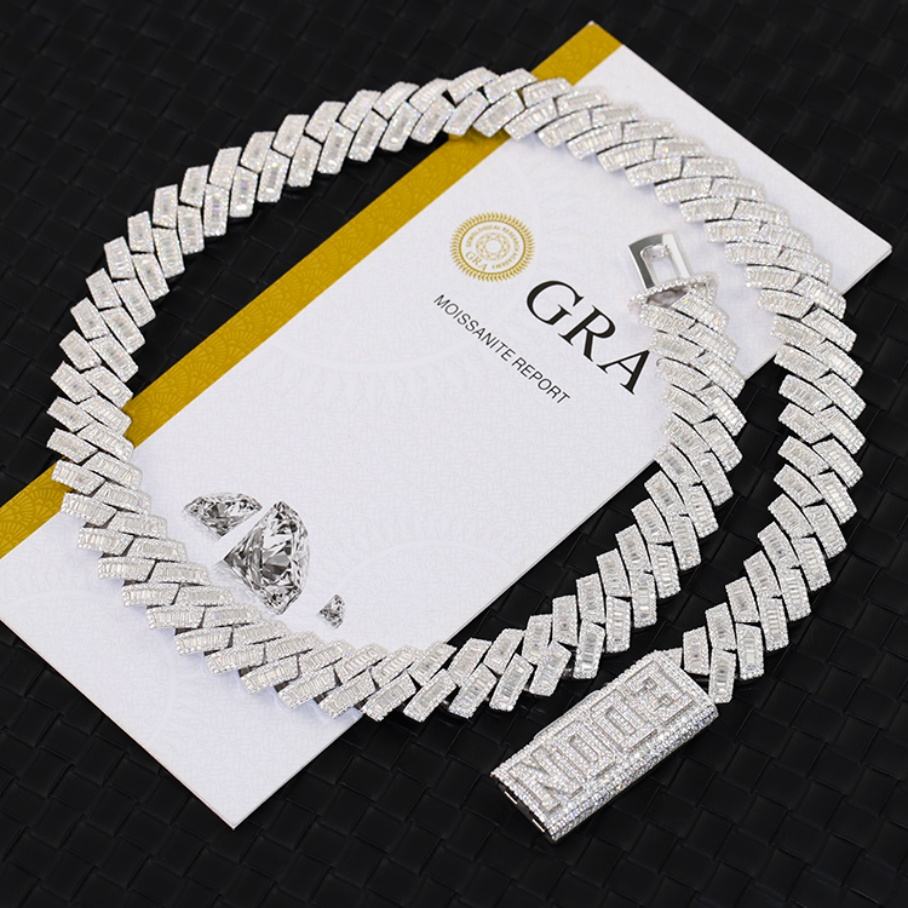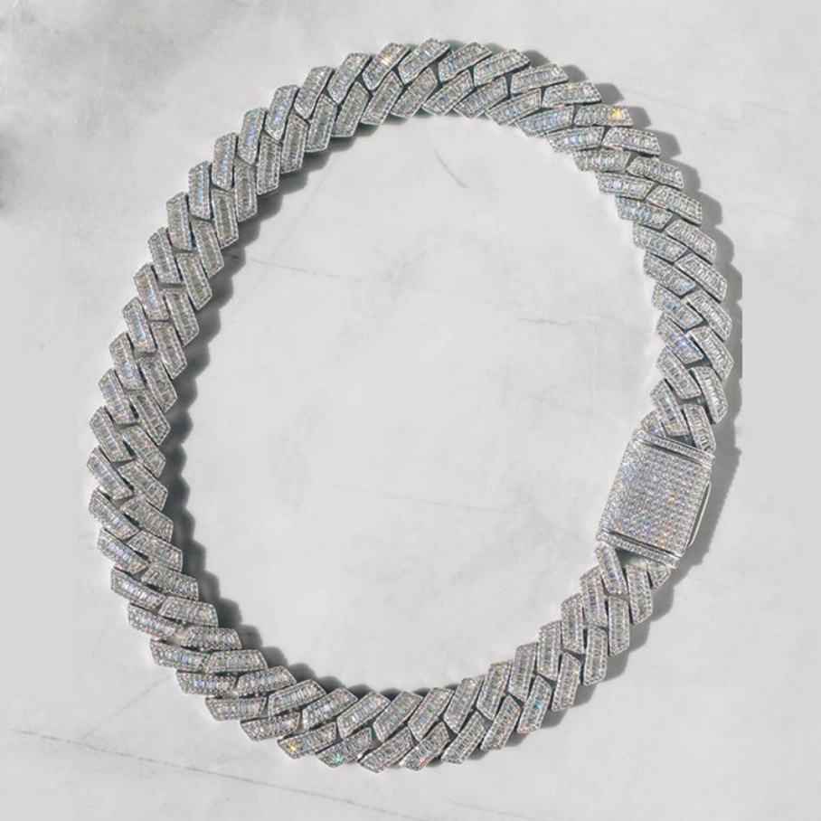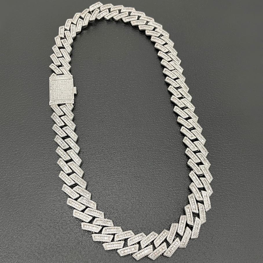 สร้อยคอคิวบาลิงค์ชุบทองคำขาว S925 ขนาด 15 มม. 18 มม. 20 มม. แบบกำหนดเอง ประดับด้วยมอยส์ซาไนต์ทรงบาแก็ตต์ VVS