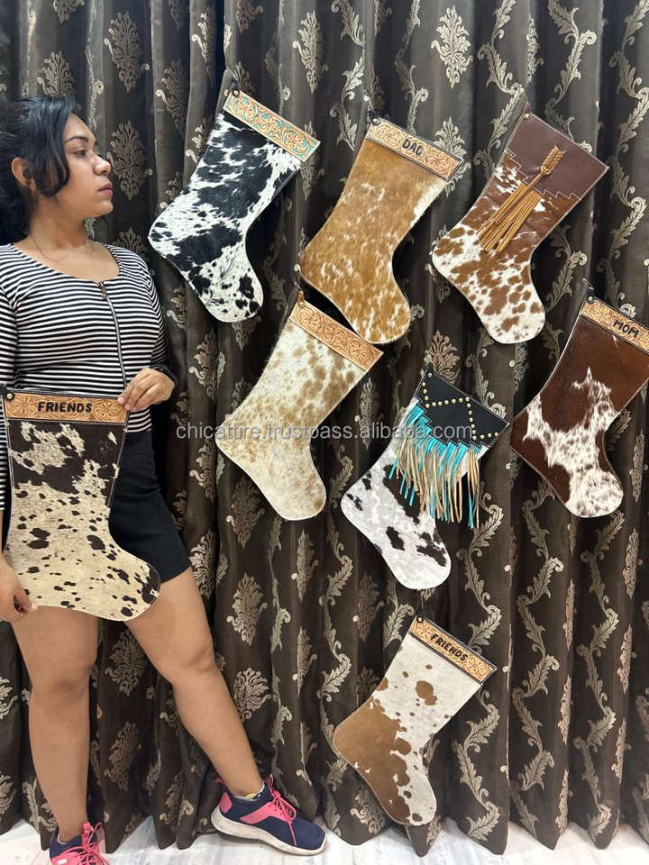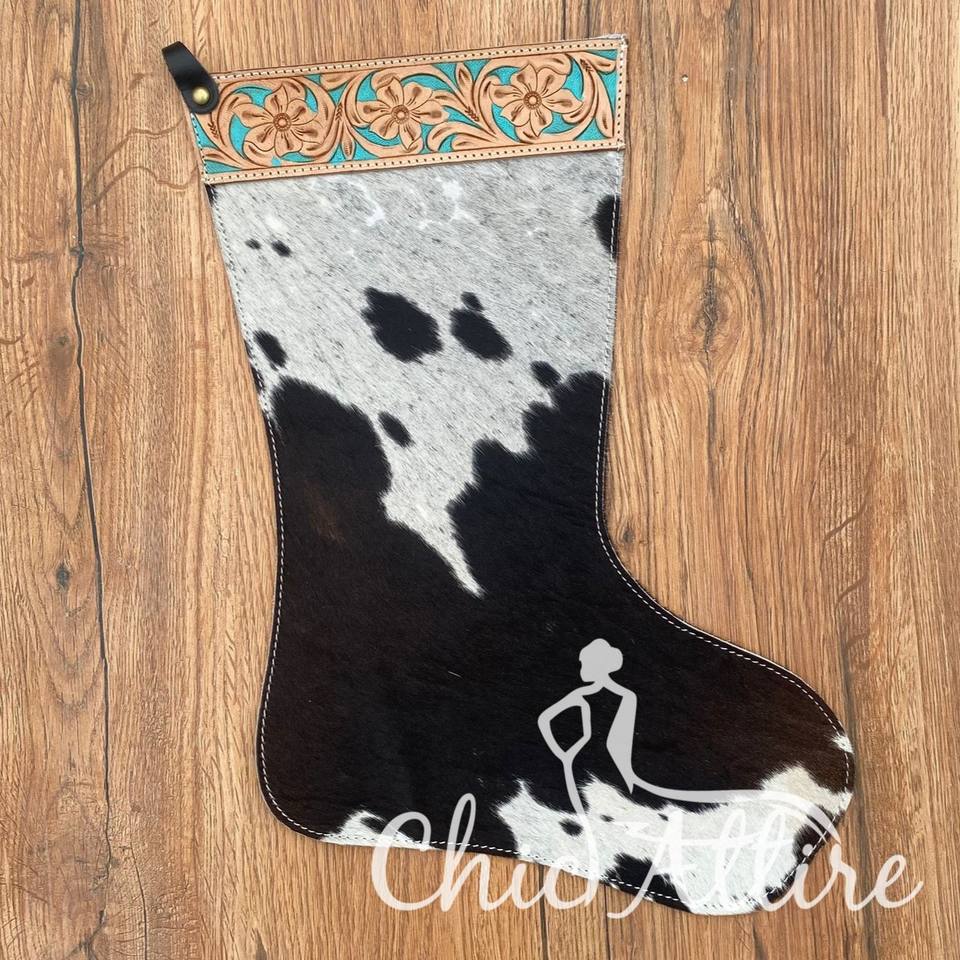 ถุงเท้ายาว16 "สำหรับวันหยุดเทศกาลคริสต์มาสขนาดใหญ่แบบตะวันตกถุงน่องลายดอกไม้หนังวัวสีเทอร์ควอยซ์