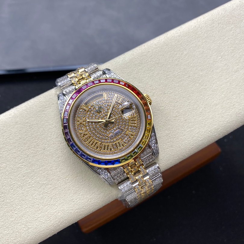 นาฬิกากลไกสีทอง18K แบบกำหนดเองคุณภาพสูง40มม. สีรุ้งเพชรโมอิสกันน้ำจระเข้เสน่ห์ของซิลิโคน