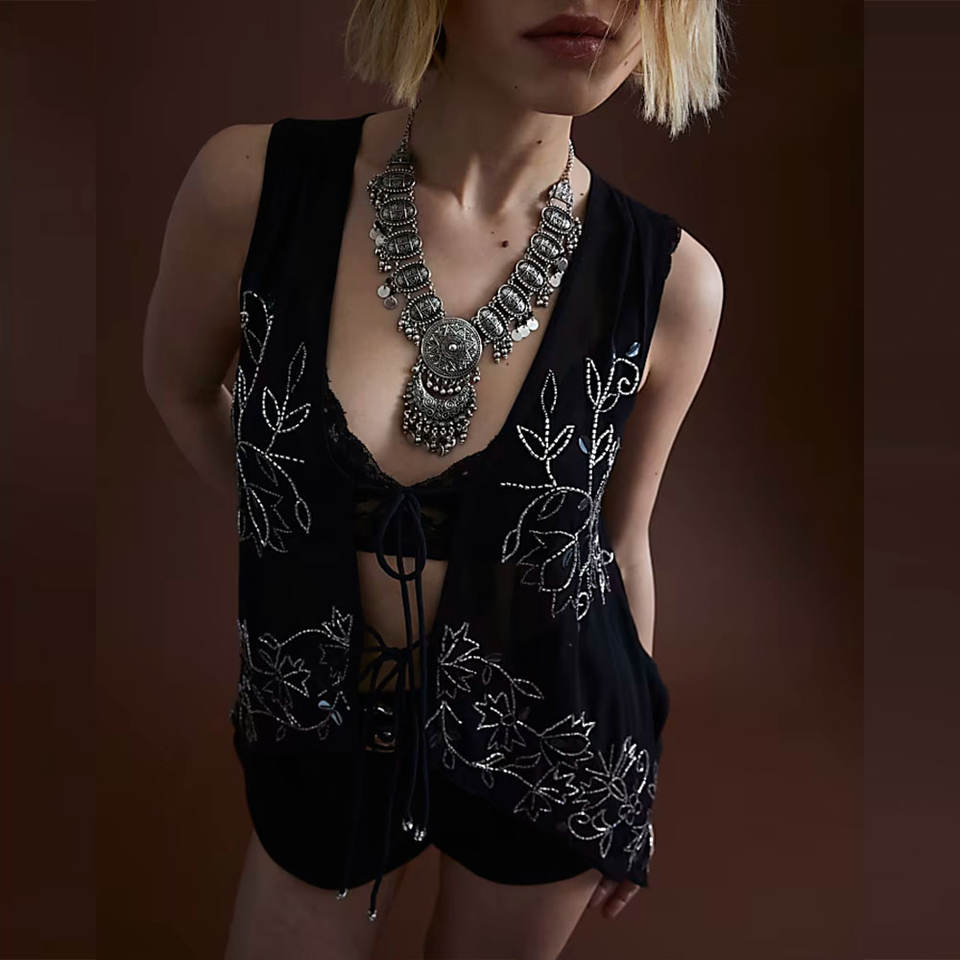 เสื้อกั๊กผู้หญิงแบบสั่งตัด รุ่นซัมเมอร์ 2025 สีดำ แขนกุด คอวี ทรงเข้ารูป สไตล์ลำลอง ผลิตจากโพลีเอสเตอร์ 100% ระบายอากาศได้ดี
