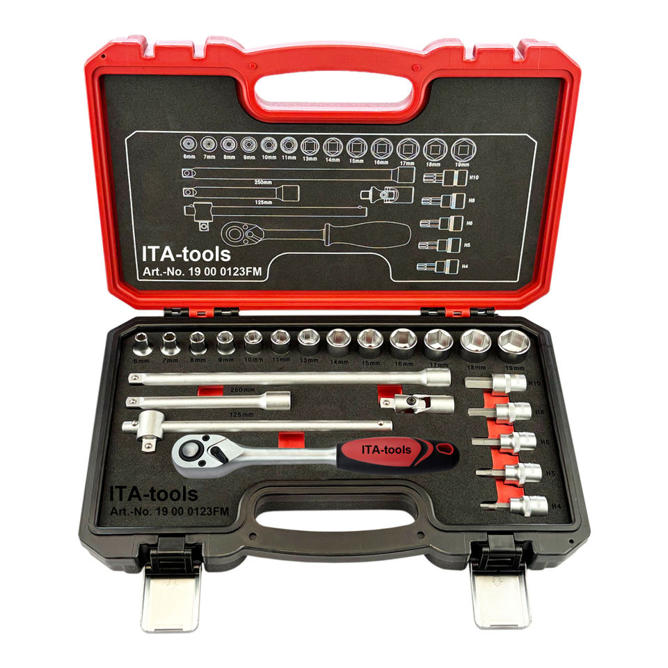 ชุดซ็อกเก็ตเครื่องมือ23ชิ้นพร้อมตัวเลื่อน T ด้ามหกเหลี่ยมและเฟืองล้อขนาด72ตัน3/8ออกแบบได้เองแหล่งจ่ายไฟด้วยมือ