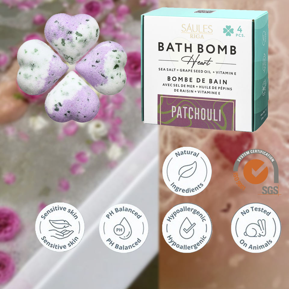 ชุดของขวัญบาธบอมแบบกำหนดเอง 360 กรัม 4 ชิ้น อาบน้ำอโรมาเธอราพี กลิ่นแพทชูลี่ ผ่อนคลายด้วยเกลือทะเล รูปหัวใจ รับผลิตแบบ OEM