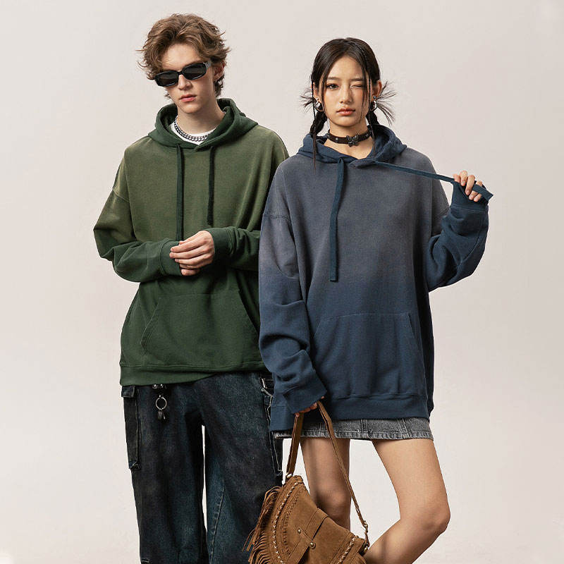 เสื้อฮู้ดดี้ทรงหลวมโอเวอร์ไซส์ ผ้าวูลเนื้อหนัก 370GSM สไตล์เรโทรสุดเทรนดี้ ลวดลายไล่เฉดสีแบบวงกลม ซักฟอกแบบ Acid-Washed