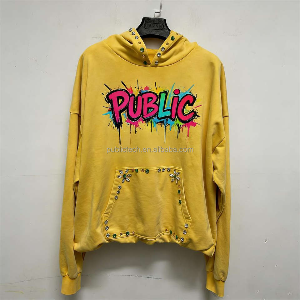 เสื้อฮู้ดดี้ผ้าหนา 400GSM แบบสั่งทำพิเศษ ขอบเสื้อหดตัวได้ ซักแบบวินเทจ พิมพ์ลายกราฟฟิตีด้วยเทคนิค DTG ประดับเพชรและคริสตัล สำหรับผู้ชาย